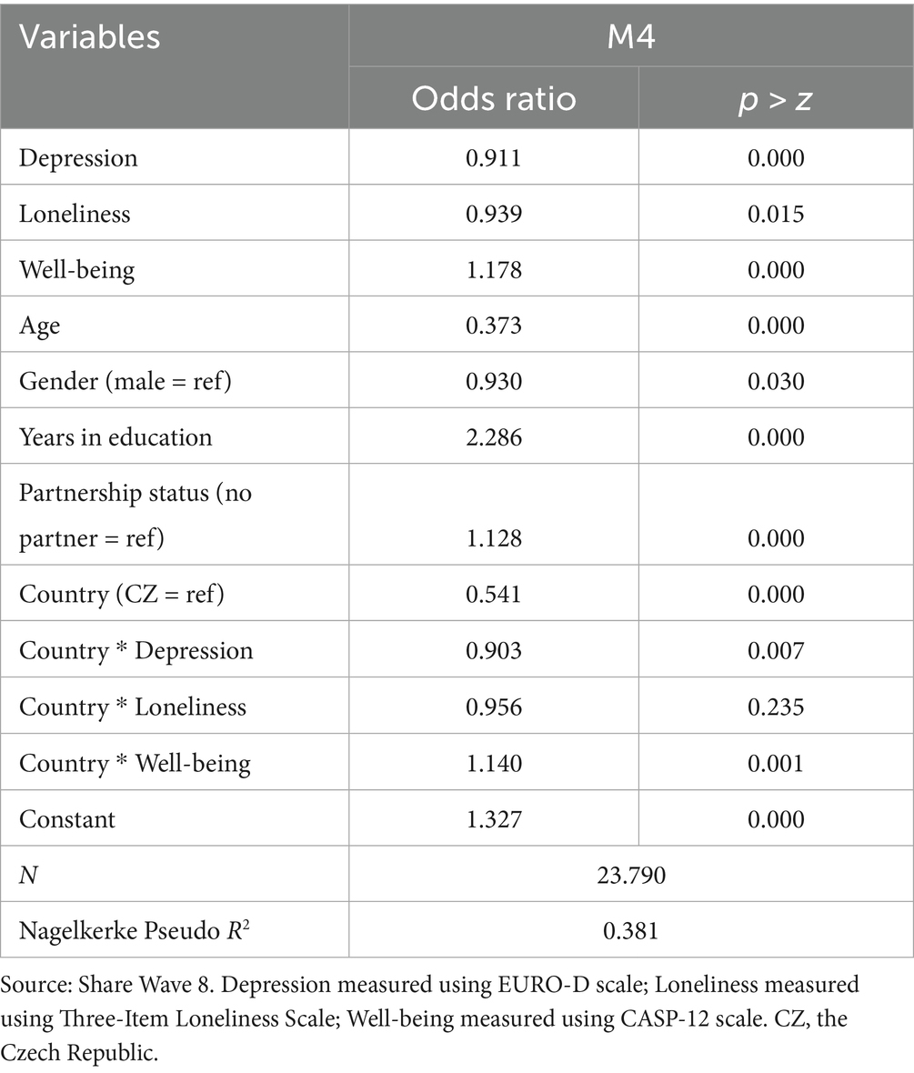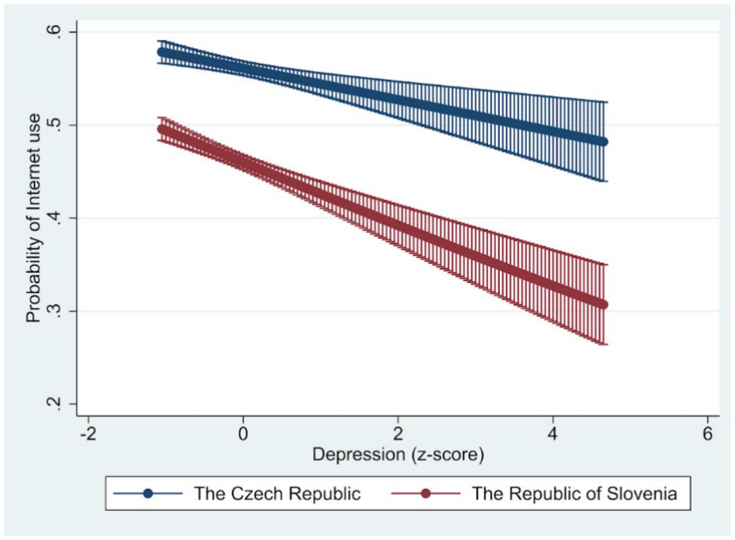 According to the final models, all three mental health variables significantly affect the probability of Internet use. The increase on the depression scale is associated with a decrease in the odds of Internet use in the Czech Republic (9% per one standard deviation) and in the Republic of Slovenia (18% per one standard deviation). Similarly, each increase of standard deviation of the loneliness scale reduces the odds by 8 and 10%, respectively. On the other hand, well-being exerts a positive influence: each additional point on the CASP–12 scale increases the likelihood of Internet use by 17% in the Czech Republic and 33% in the Republic of Slovenia.