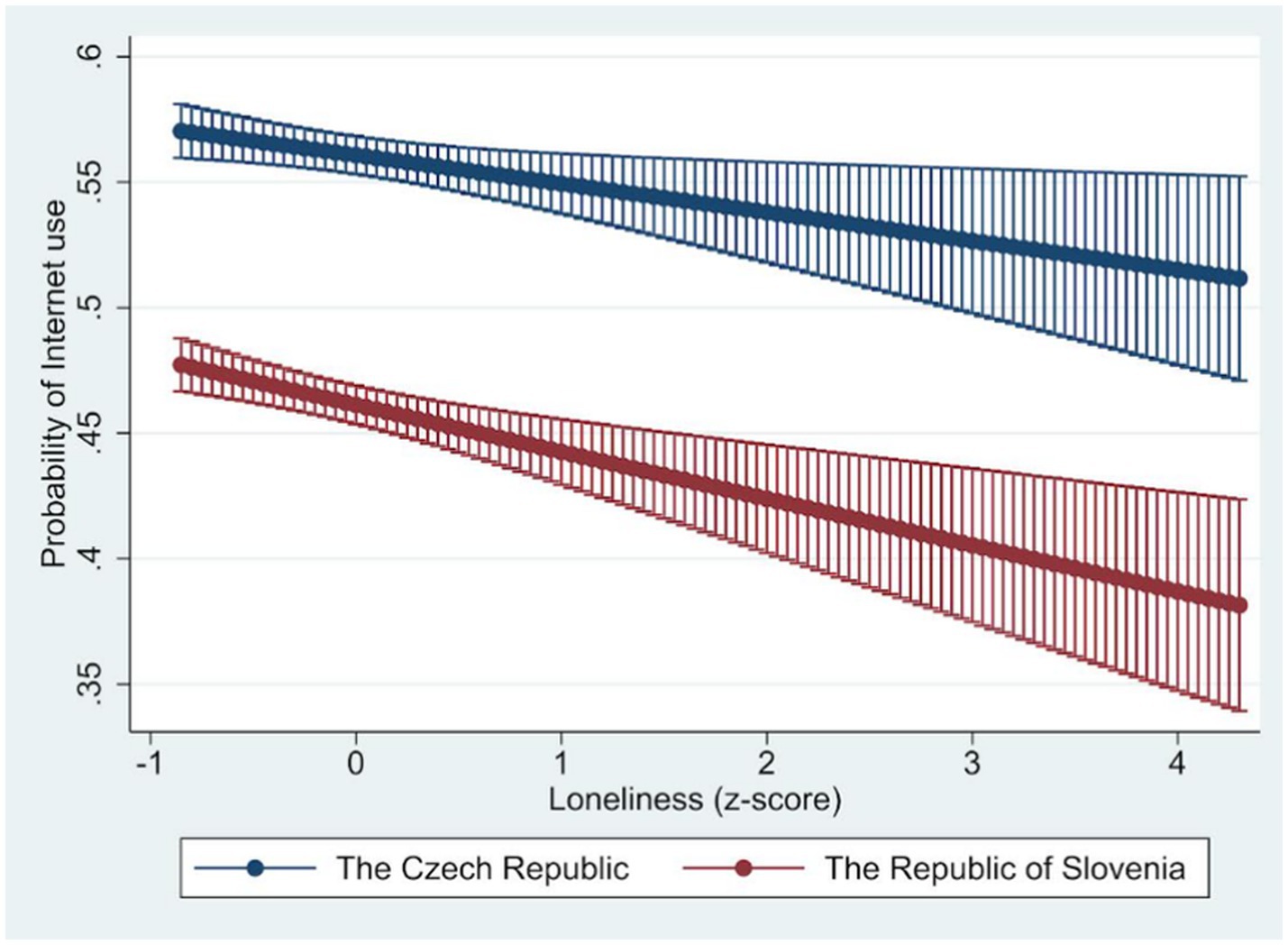 Figure 2. Marginal effect of loneliness on the probability of Internet use. Source: Share Wave 8. Loneliness measured using Three-Item Loneliness Scale; Marginal effects predicted from model M4, 95% CI lines.