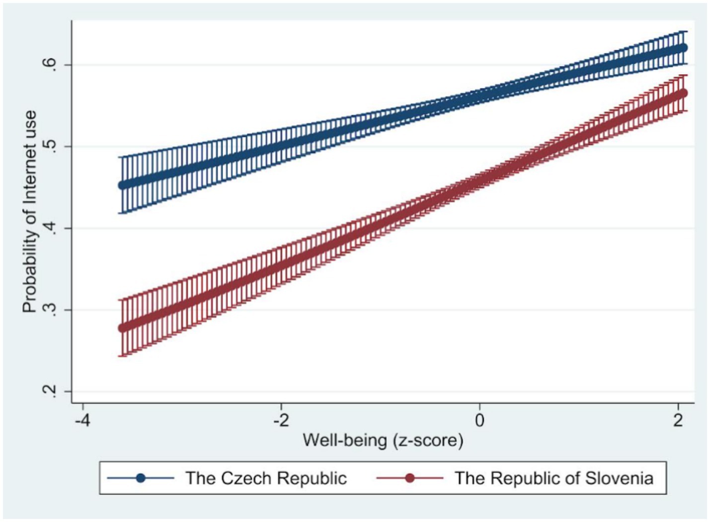 Gender and partnership status showed weaker and more context-dependent effects. In the Czech Republic, women were 2.5% less likely to use the Internet, though this difference was not statistically significant. In the Republic of Slovenia, however, women were 13% less likely to be Internet users, and this difference was significant. Finally, living with a partner increased the odds of Internet use by 30% in the Republic of Slovenia but had no significant effect in the Czech Republic.