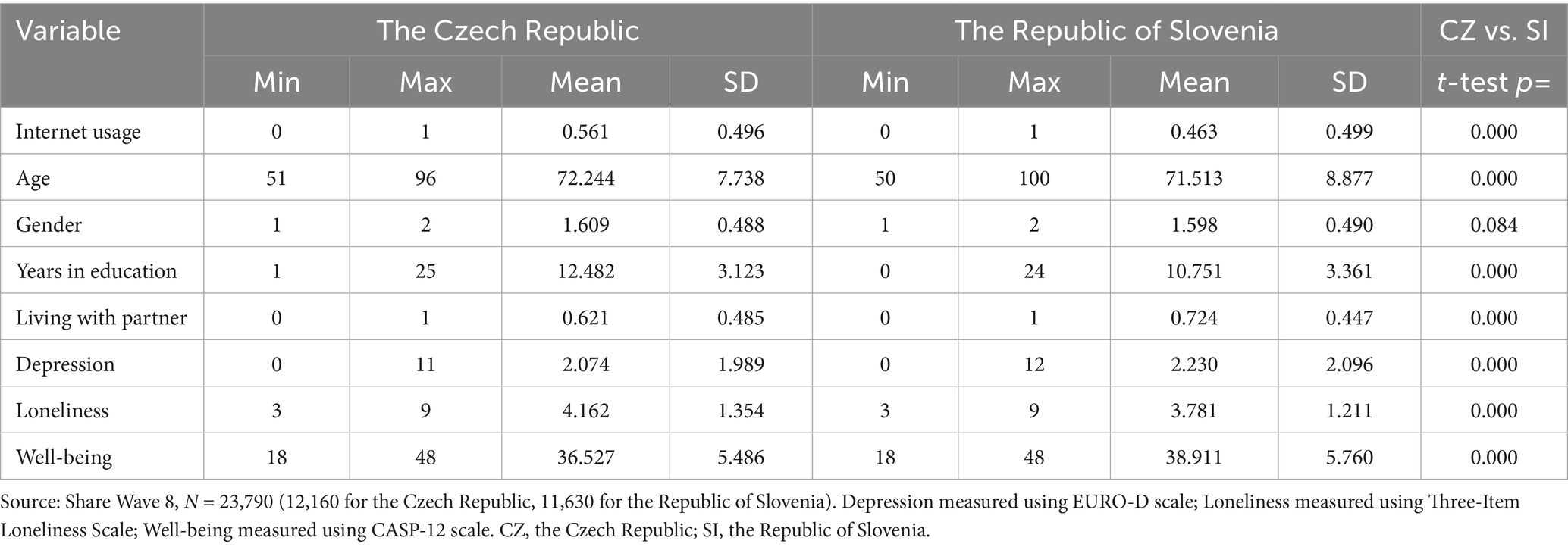 As part of this study, it is essential to report digital skills levels in these countries. Specifically, in 2019—the reference year for analyzing the relationship between Internet use and mental health—the proportion of older adults (aged 55–74 years) with low, basic, and above basic digital skills was 65.66% in the Czech Republic and 58.73% in the Republic of Slovenia (42). Despite the observed difference in digital skills between the two nations, we anticipate that the findings concerning the impact of mental health on Internet use will be comparable.