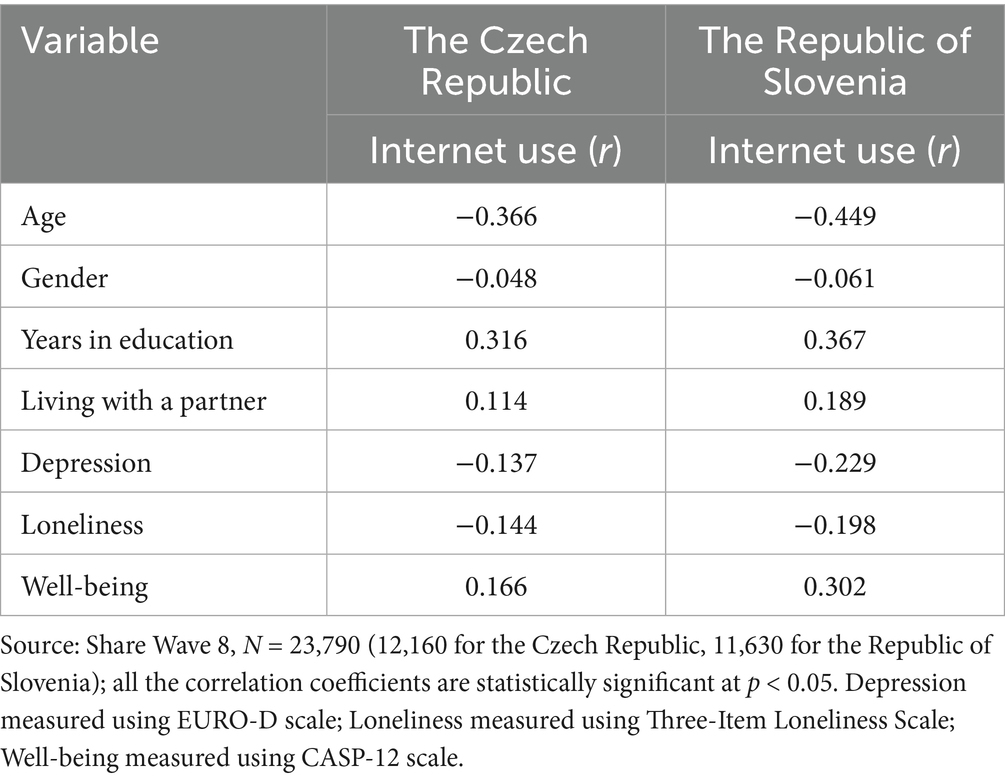 Results: Internet use was positively associated with higher well-being and negatively associated with depression and loneliness in both countries. These associations were stronger in the Republic of Slovenia as compared to the Czech Republic. Age and education were the most significant control variables. Women and individuals living alone in the Republic of Slovenia were less likely to use the Internet.