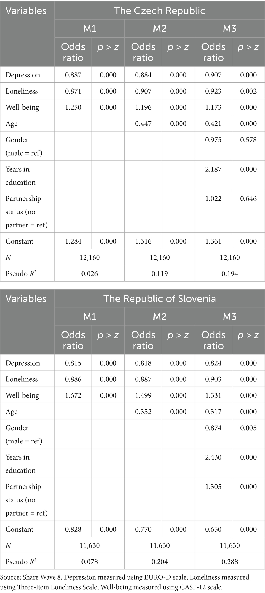 Methods: A sample of 5,201 adults aged 50 + (2,706 Czech, 2,495 Slovenian) was analyzed. Internet use in the past 7 days was the dependent variable. Depression (EURO-D), loneliness (Three-Item Scale), and well-being (CASP-12) served as key independent variables. Binary logistic regression was used, controlling for age, gender, education, and partnership status. To address missing data and enhance analytical robustness, a 1-to-many imputation approach was applied.