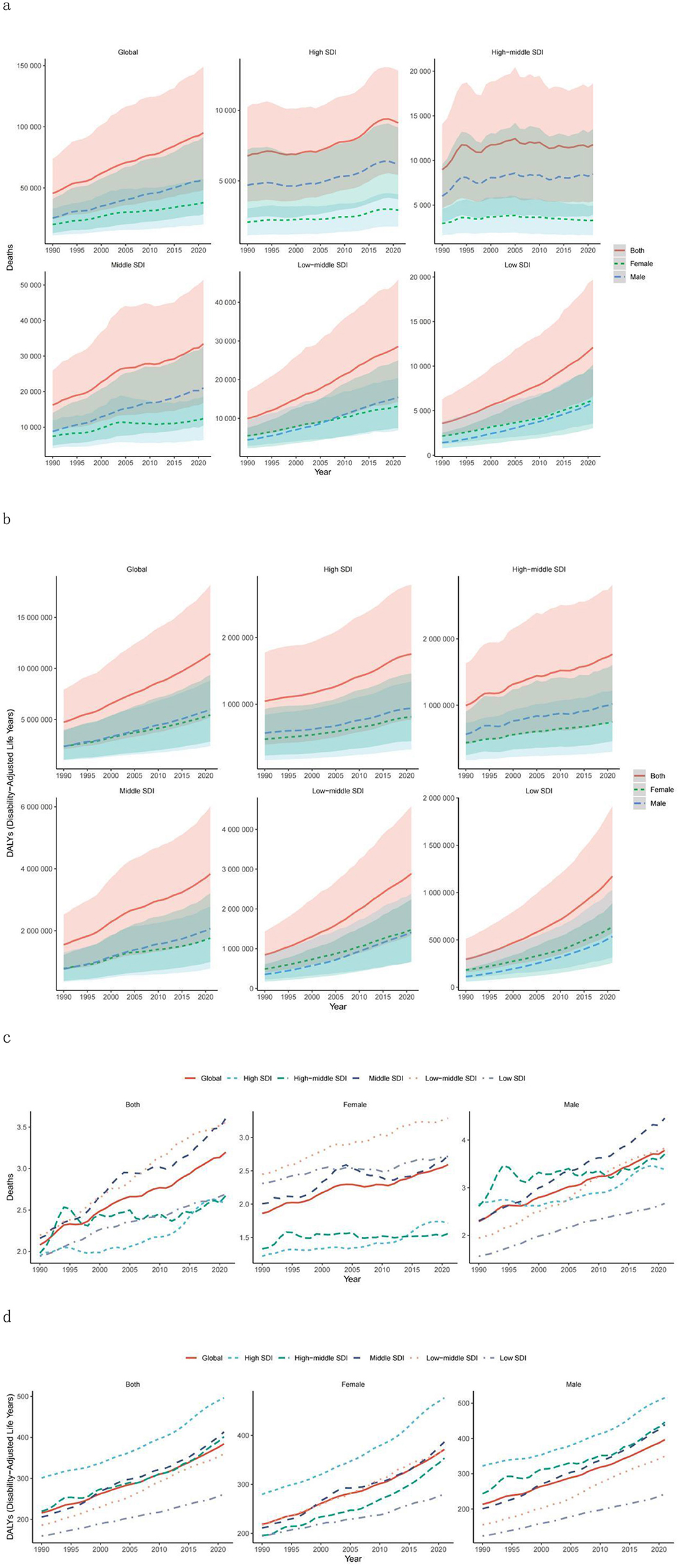 The analysis of regions stratified by SDI levels revealed that from 1990 to 2021, both death and DALY rates in SDI regions significantly increased. The increases were more pronounced in the low-SDI, low–middle-SDI, and middle-SDI regions than in the other SDI regions, with high-school-SDI regions showing the most significant increase (Tables 1, 2; Figures 1a, b). Notably, mortality and DALY rates in SDI regions have shown an increasing trend from 1990 to 2021 (Tables 1, 2; Figures 1a, b).