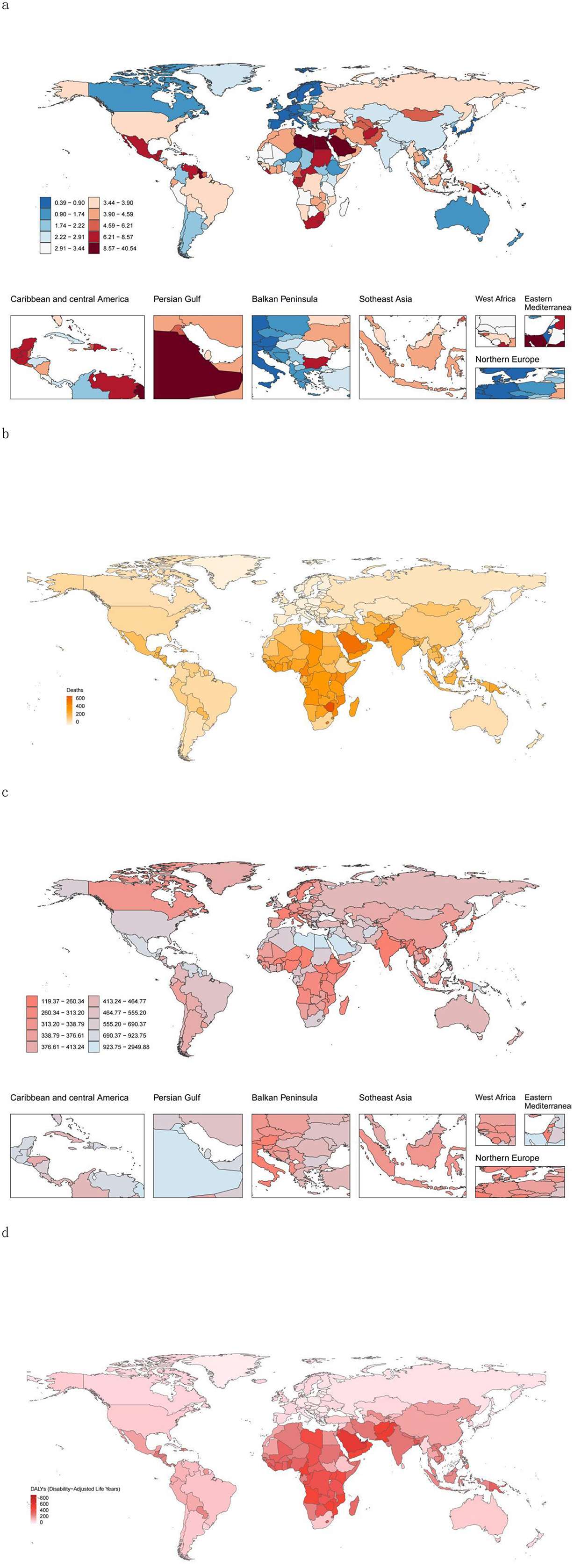 Figure 2. High-BMI-related burden globally in youths and young adults in 204 countries/territories. (a) Mortality rate in 2021. (b) Change in the number of deaths attributable to High-BMI between 1990 and 2021. (c) DALY rate in 2021. (d) Change in the DALYs attributable to HSBP between 1990 and 2021. DALY, disability-adjusted life year.