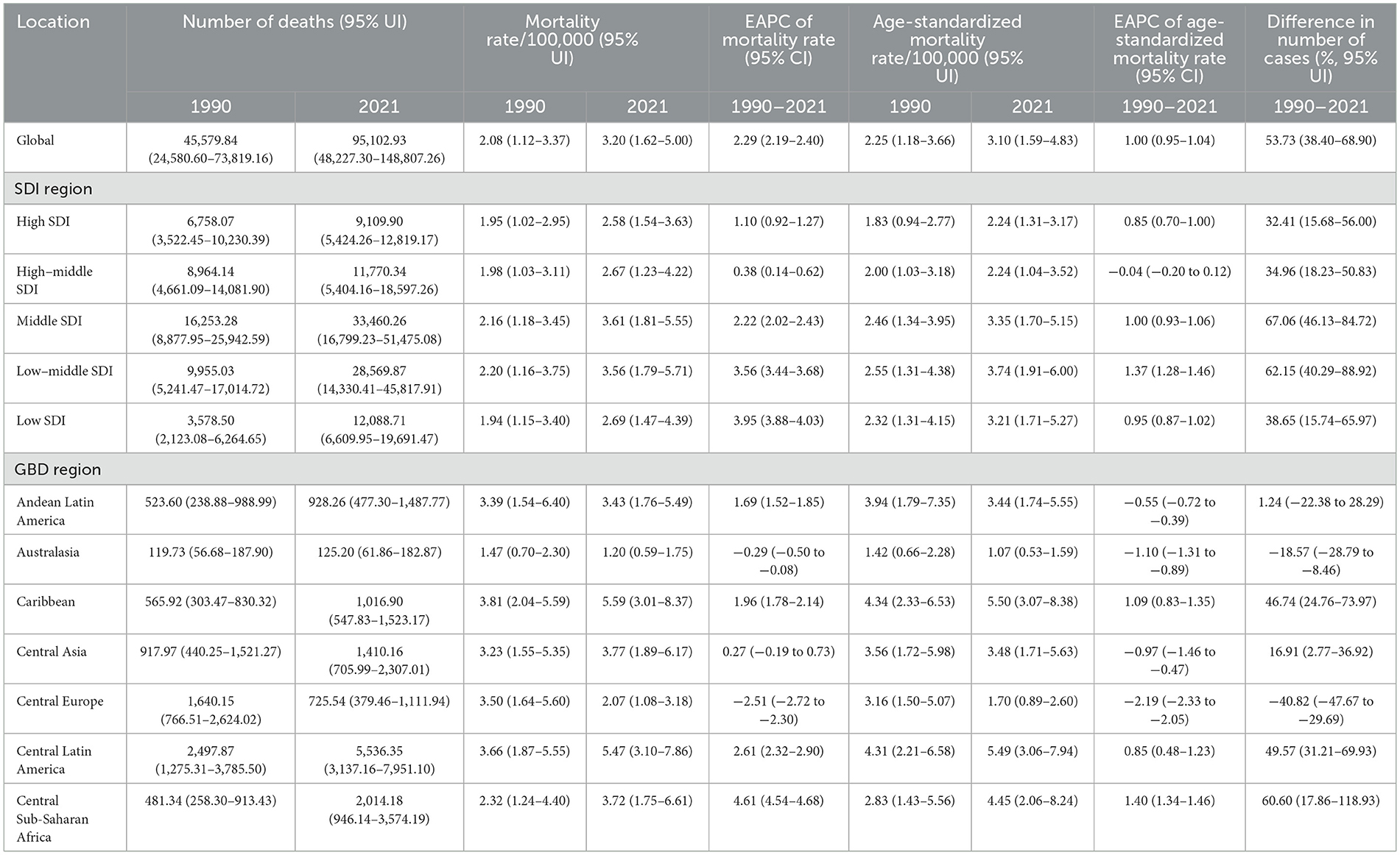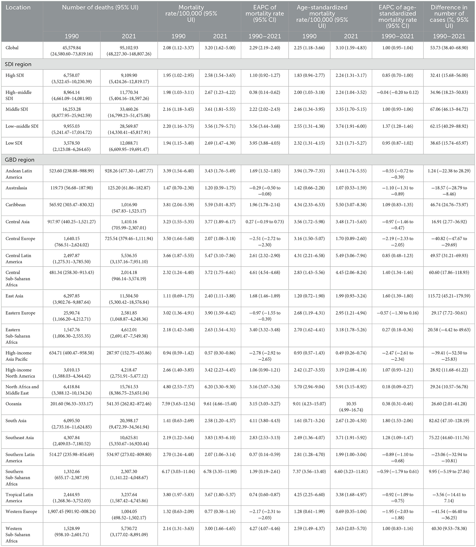 In 2021, Oceania had the highest death and DALY rates, with a substantial increase compared with most GBD regions. Conversely, the high-income Asia Pacific region maintained the lowest death and DALY rates, which were consistently lower than those reported in other regions (Tables 1, 2; Supplementary Figure S1).