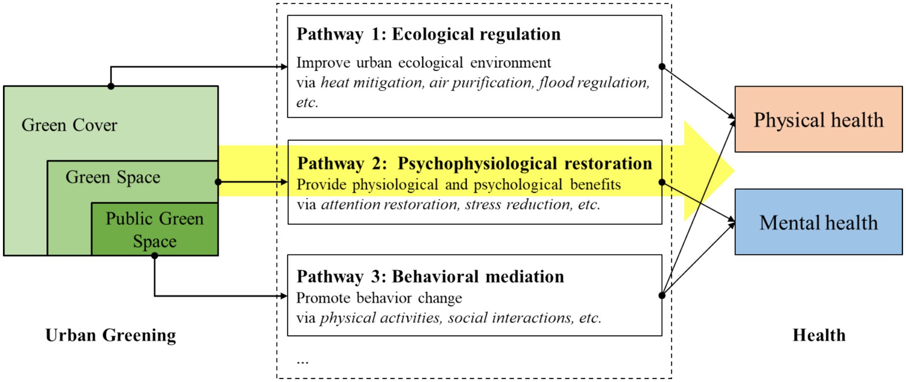 Theoretically, three major pathways have been proposed to explain how greening affects human health (5, 16, 63) (see Figure 1). The first pathway, ecological regulation: vegetation contributes to cleaner air, moderated urban microclimates, and reduced environmental health risks (14, 18). The second pathway is psychophysiological restoration: natural elements provide sensory stimuli that support stress recovery, improve mood, and enhance cognitive performance (19, 20). The instantaneous, affective, and physiological responses evoked by visual stimuli can reduce stress and evoke positive emotions (21). Activities in green spaces can also facilitate sleep quality (22). The third pathway, behavioral mediation: green spaces encourage physical activity and social interaction, which confer both physical and psychological benefits (23). Being physically more active can improve cardiovascular health and reduce obesity and diabetes risks (24–26). Exercises in green spaces bring more health benefits than activities conducted in other environments, such as indoors (27, 28). Public green spaces provide venues for social interactions, encouraging frequent connections among friends and neighbors and participation in group activities (29–31). Increased social interactions are proven to benefit brain health, psychological well-being, and reduce loneliness (32).
