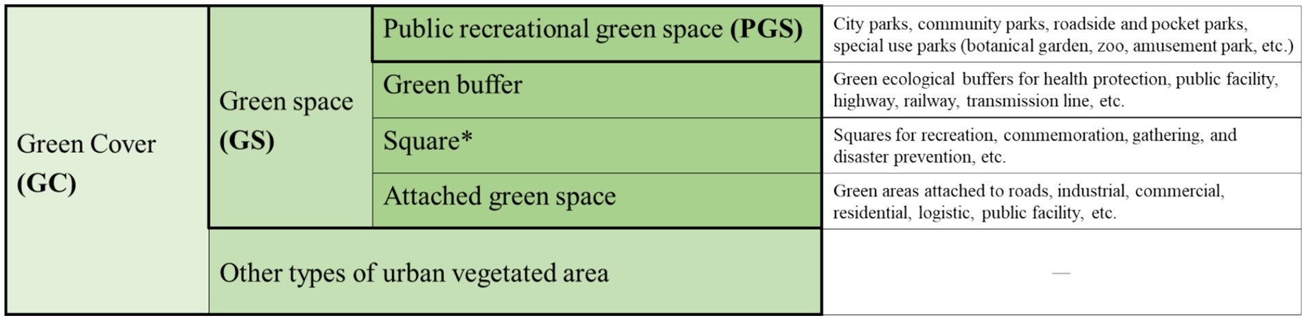 Figure 2. Classification of urban greening types. *Among the four types of green spaces (GS), urban squares, aside from public recreational green spaces, are also open to the public. However, they make up a very small portion of the GS area. Therefore, this study only utilized public recreational green space to represent PGS. This classification was based on the Chinese Standard for Classification of Urban Green Space CJJ/T85-2017.