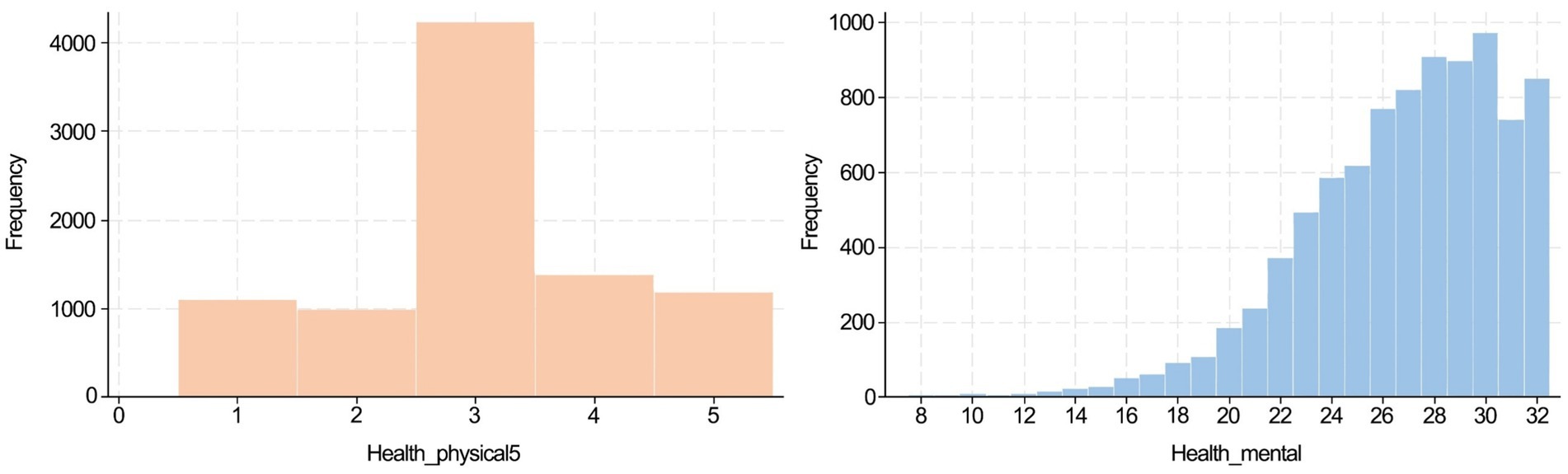 Two dimensions of health were assessed: physical health and mental health, both based on self-rated data. Self-rated health offers several advantages over objective health measures. First, it reflects individuals’ holistic understanding of their health, incorporating illness severity, family health history, and perceived stability of health status (41, 42). Second, it demonstrates strong predictive validity for objective outcomes such as functional ability, mobility, and absenteeism, and this predictive power is consistent across socioeconomic strata (34, 43). Accordingly, self-reported health metrics are widely used in both international and Chinese population health studies (5, 34).