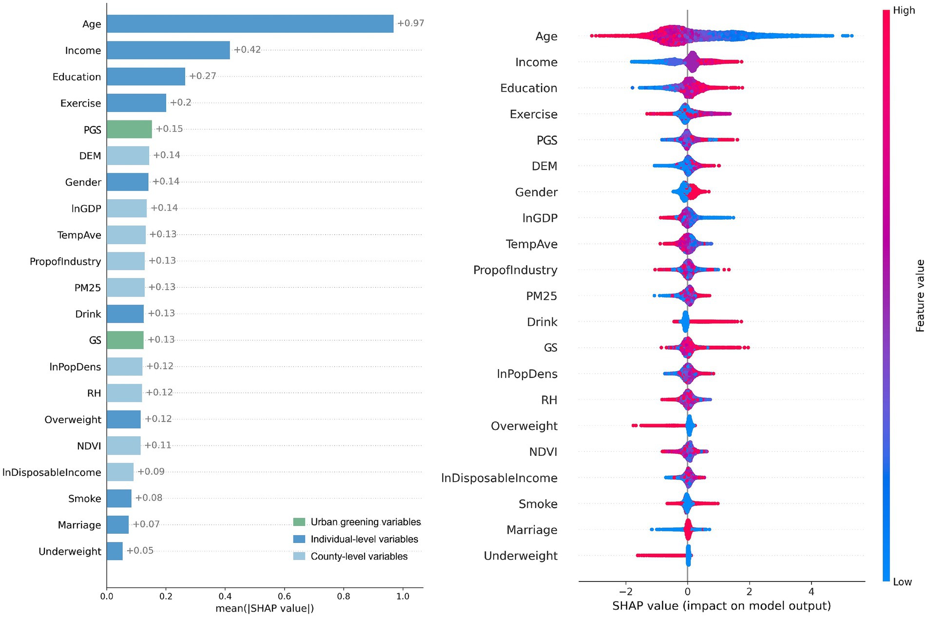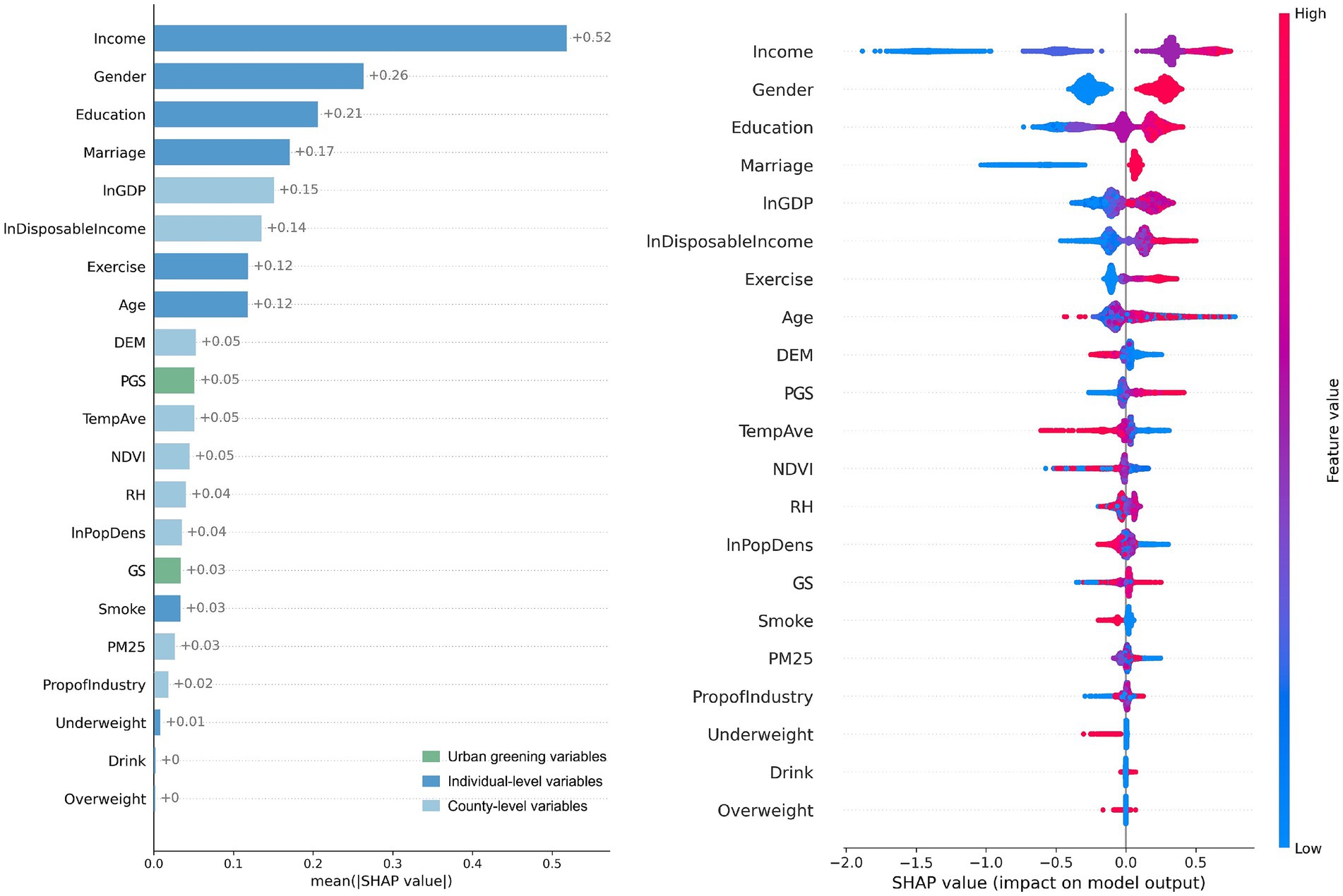 Discussion: These findings emphasize that not all green space yields equivalent health benefits; rather, the provision of sufficient, accessible, and active public green space is critical for maximizing the dual health benefits of urban greening.