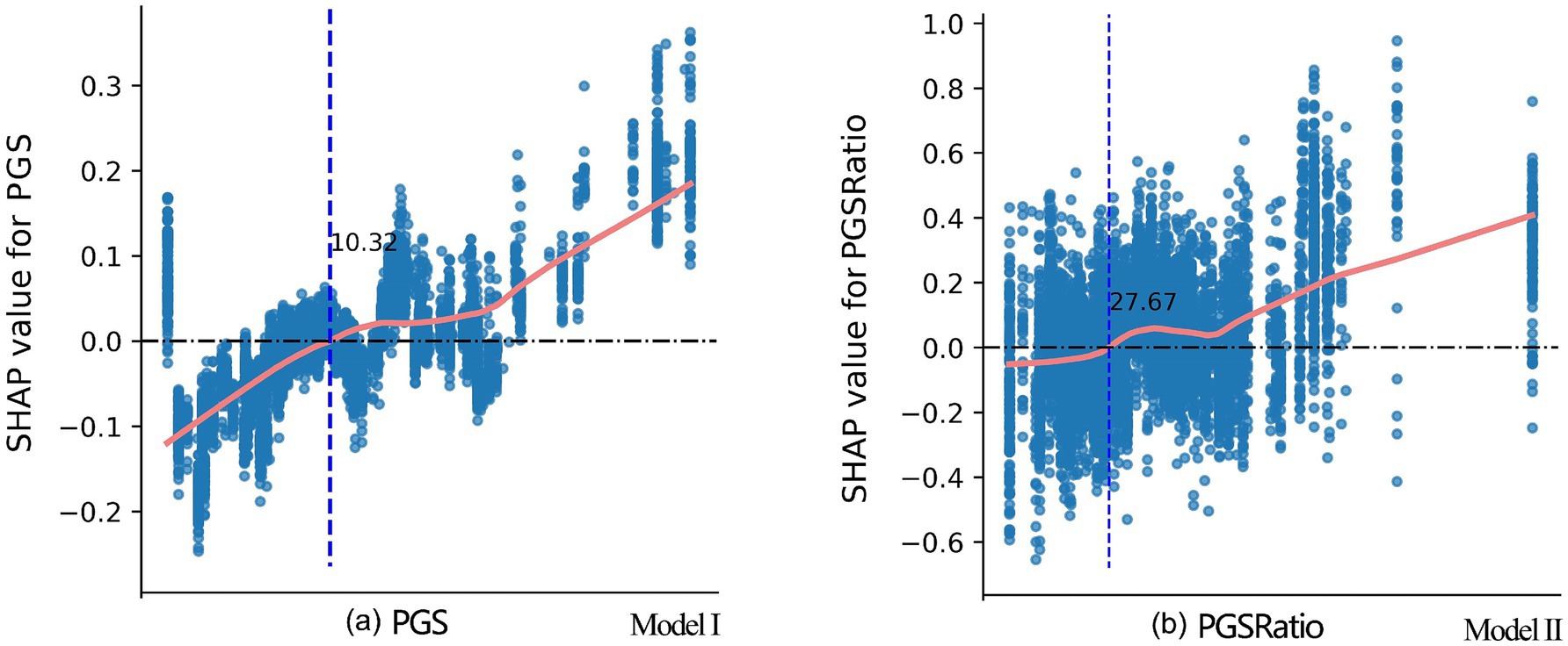 Figure 5. SHAP dependence plots for PGS and PGSRatio from Model I and Model II, respectively. The marks of the x-axis are not provided due to confidentiality requirements set by CFPS for the County-Level Restricted Data. Disclosure of this information may enable readers to identify specific counties or districts, which are subject to strict restrictions imposed by CFPS. The approximate turning point values for PGS (18%) and PGSRatio (45%) were provided by CFPS staff who can actually see the marks on x-axis.