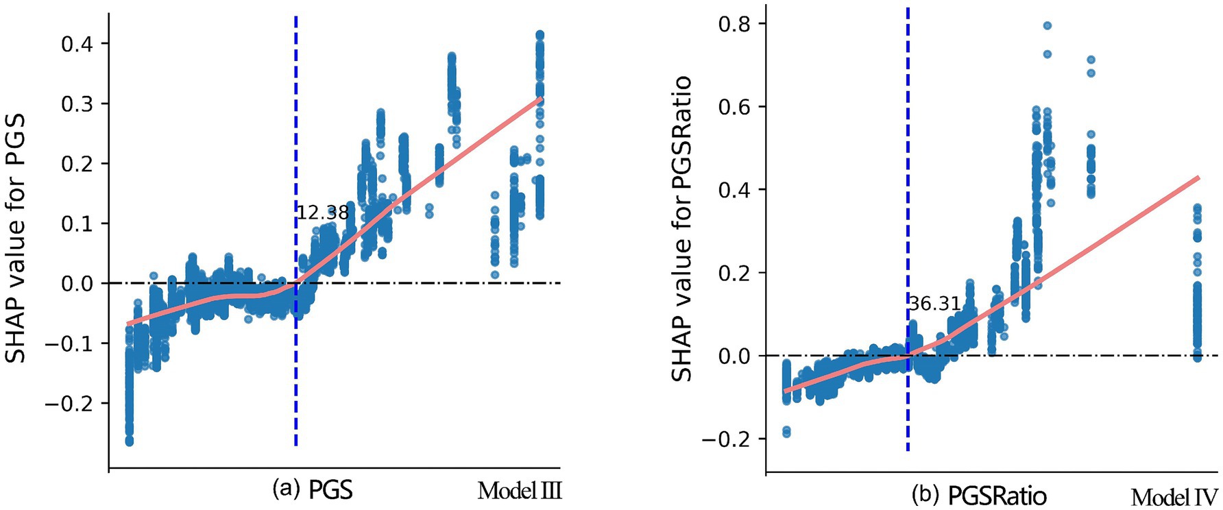 Figure 7. SHAP dependence plots for PGS and PGSRatio from Model III and Model IV, respectively. The marks of the x-axis are not provided due to confidentiality requirements set by CFPS for the County-Level Restricted Data. Disclosure of this information may enable readers to identify specific counties or districts, which are subject to strict restrictions imposed by CFPS.