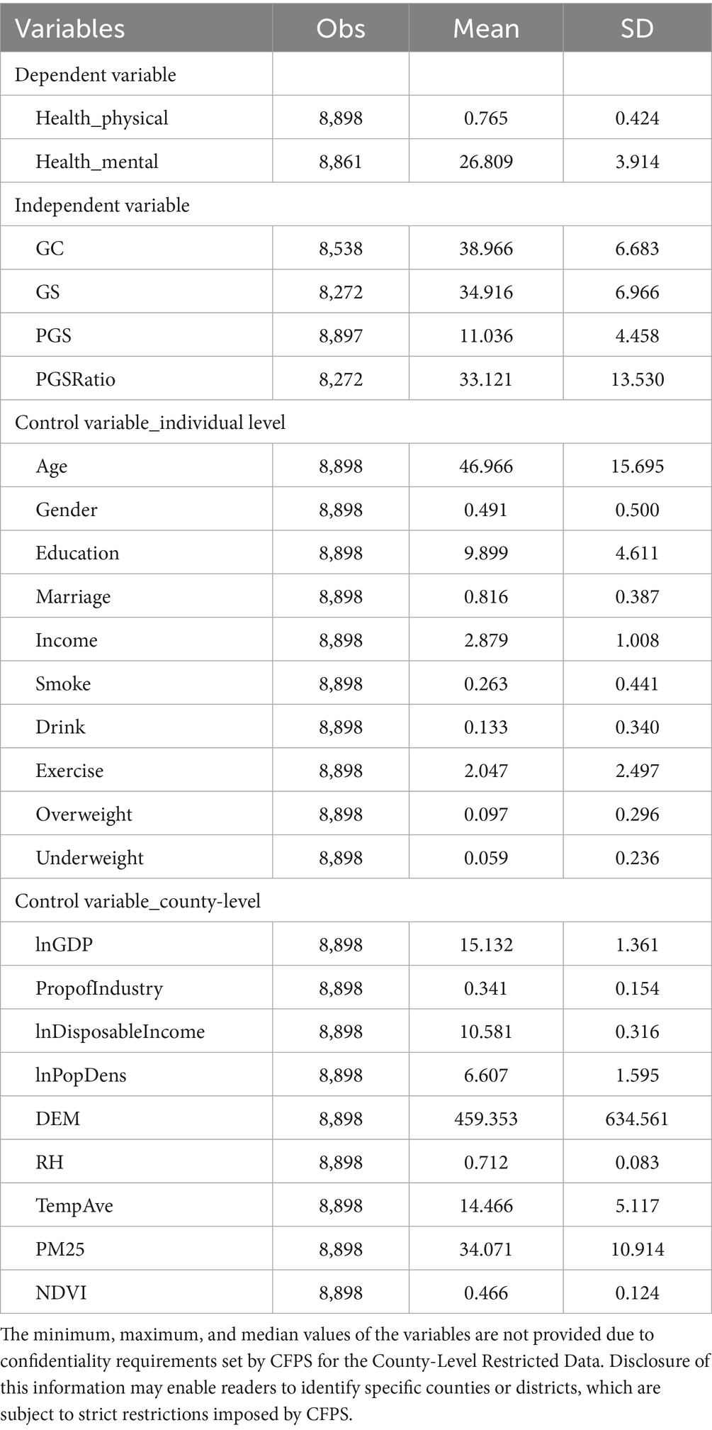 Due to CFPS confidentiality policies, address-level information below the provincial level (i.e., prefecture, county, and district) is anonymized. Consequently, spatial distribution maps of respondent locations and associated greening or health data are not provided in this study.