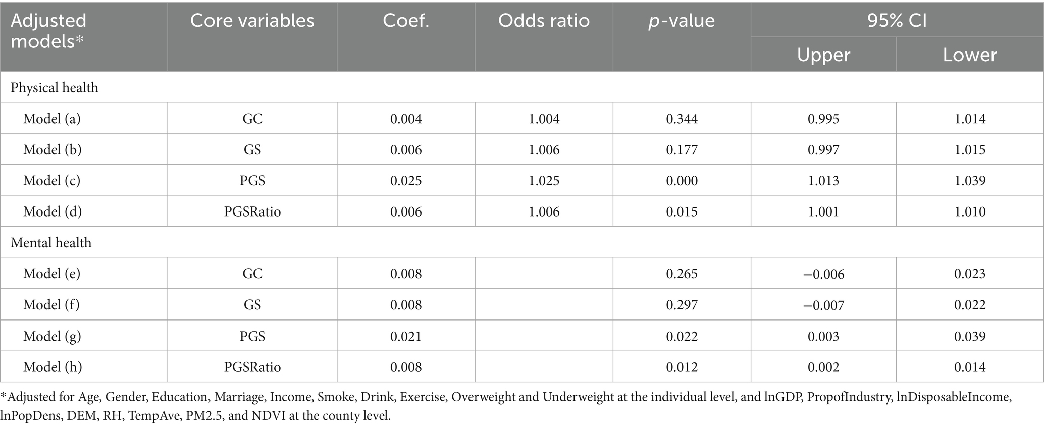 We examined the associations between each of the four urban greening indicators and self-rated physical health by constructing four separate binary logistic regression models [Model (a)–(d)]. Each model included one greening indicator as the core independent variable, along with a set of covariates. The results are presented in Table 2 and detailed in Supplementary Table S5. Variance Inflation Factors (VIFs) for these four models are between 2.10–2.30. The analysis revealed that GC and GS were not significantly associated with physical health status. By contrast, PGS and PGSRatio demonstrated statistically significant positive effects.
