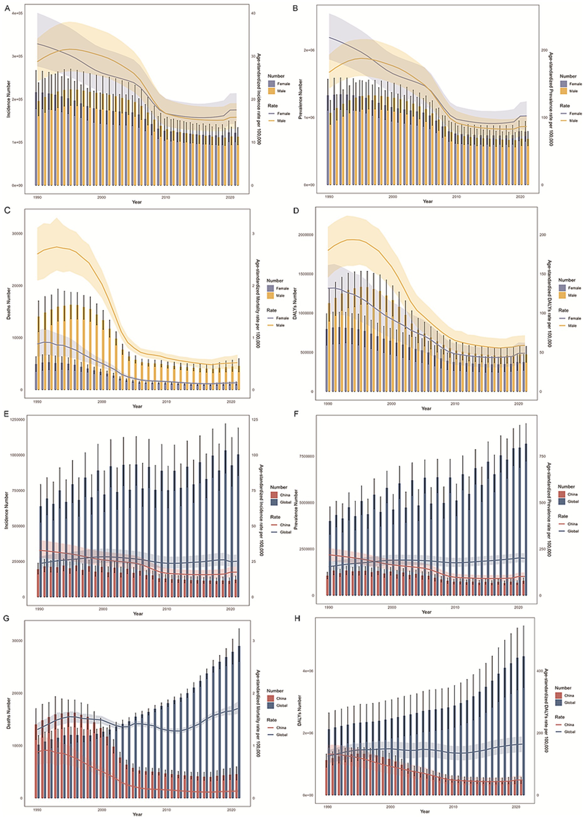 Between 1990 and 2021, the incidence and prevalence of OUD in China, including both crude and age-standardized rates, were comparable to those in males. By 2021, the disease burden among females had surpassed that of males (Tables 2–5; Figures 1A,B). In contrast, in terms of mortality rate and DALYs, both in absolute numbers and age-standardized rates, the disease burden was higher in females than in males (Figures 1C,D). Overall, the disease burden of OUD in China showed a significant decline, whereas the global burden exhibited varying degrees of increase (Tables 2–5; Figures 1E,H).