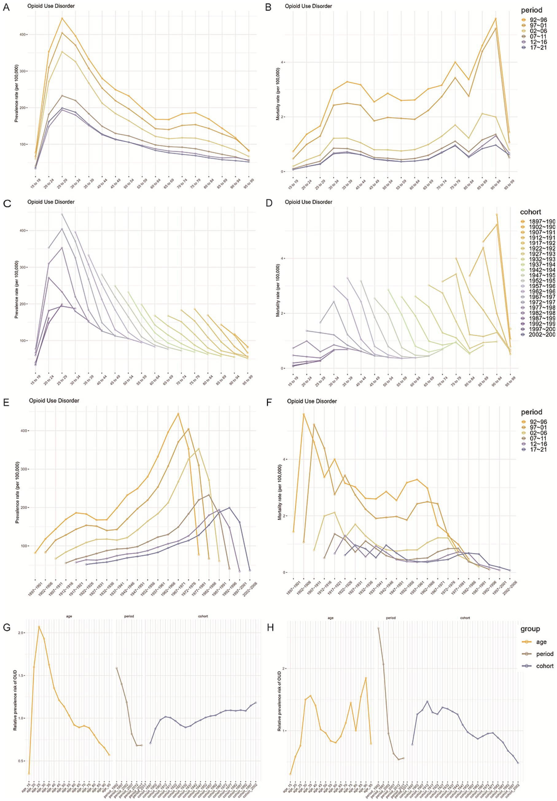 Figure 2. Age, period, and cohort effects on the incidence and prevalence of OUD in China. (A,B) Show age-specific incidence and prevalence rates of OUD. (C,D) Depict period-based trends, while (E,F) display cohort-based trends. (G,H) Present estimated age, period, and cohort effects on OUD prevalence and incidence between 1990 and 2021.
