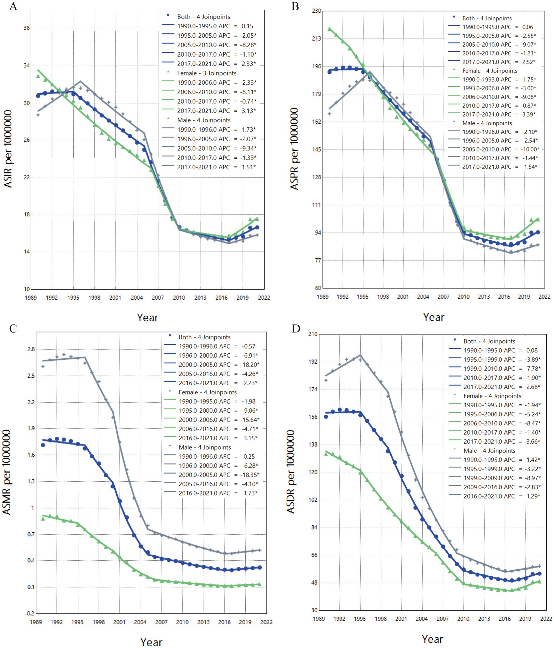 Based on the Joinpoint regression analysis conducted from 1990 to 2021, the trends in ASRs of OUD in China were further examined by gender. The annual percent change (APC) for each period highlighted significant differences in the OUD trends between males, females, and the overall population. The results showed that, over the observation period, ASIR and ASPR for males first increased, followed by a sharp decline, and finally a slight rise (Figures 3A,B). In contrast, the ASIR and ASPR for females initially showed a continuous decline, reaching their lowest point in 2017, after which a modest increase was observed. The APC for males was 1.51% for ASIR and 1.54% for ASPR, both significantly lower than the APC for females, which were 3.13 and 3.19%, respectively.
