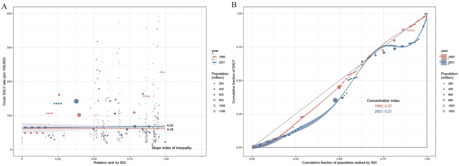 Figure 4A shows that the slope index of the DALYs rate between the highest and lowest SDI countries was 0.45 (95% UI: −18.66336, 19.56250) in 1990 and 6.02 (95% UI: −17.71235, 29.74497) in 2021. This change indicates a stronger positive correlation between DALYs and SDI during the observation period, with a notable widening of the DALYs gap between high-SDI and low-SDI countries. The concentration curves and concentration index of DALYs are presented in Figure 4B. In both 1990 and 2021, the concentration curves fell below the equality line, with corresponding concentration indices of 0.37 and 0.21, respectively.
