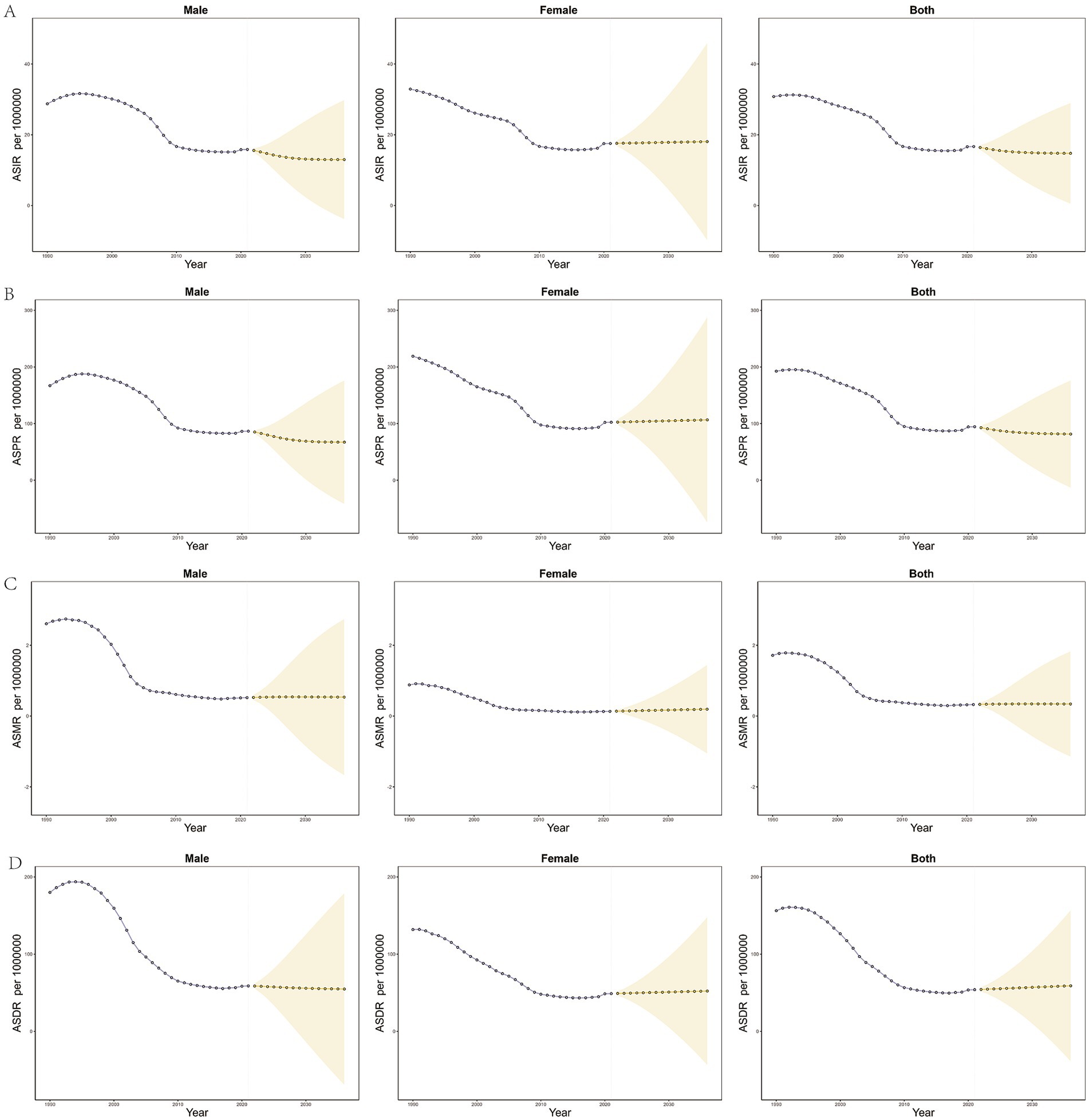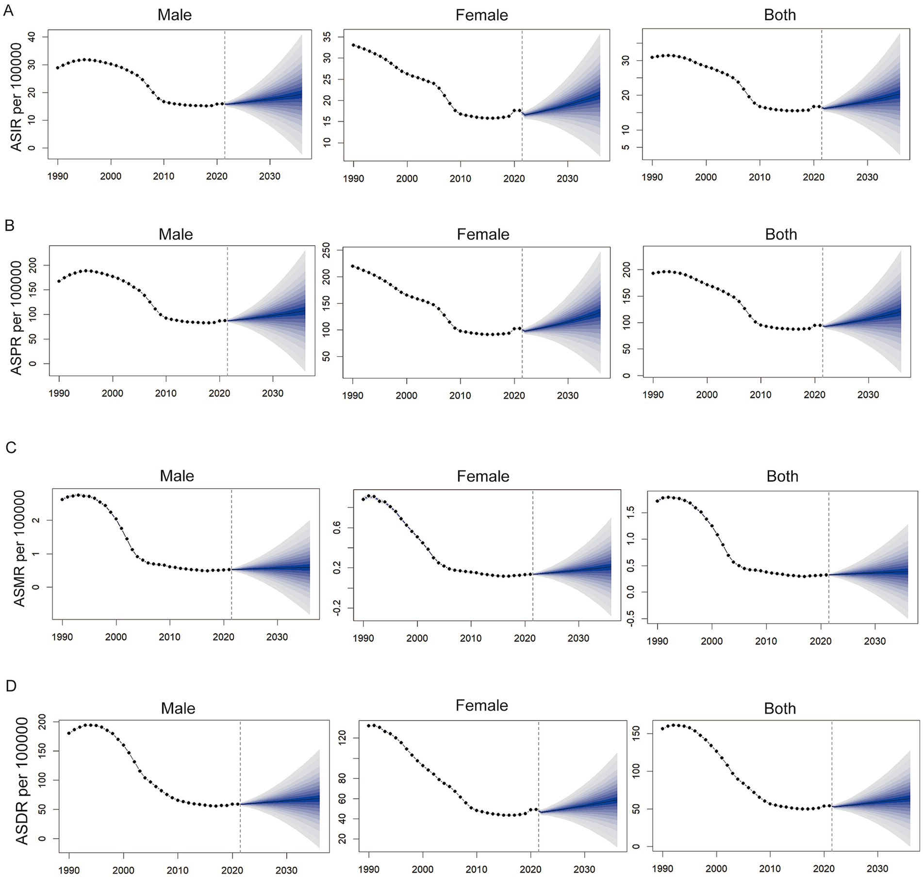 Figure 6. Predicted trends of the burden of opioid use disorder (OUD) in China based on the BAPC model from 2022 to 2035. (A) Age-standardized incidence rate (ASIR); (B) Age-standardized prevalence rate (ASPR); (C) Age-standardized mortality rate (ASMR); (D) Age-standardized disability-adjusted life years rate (ASDR) per 100,000. Each panel shows projections for males, females, and both sexes combined.