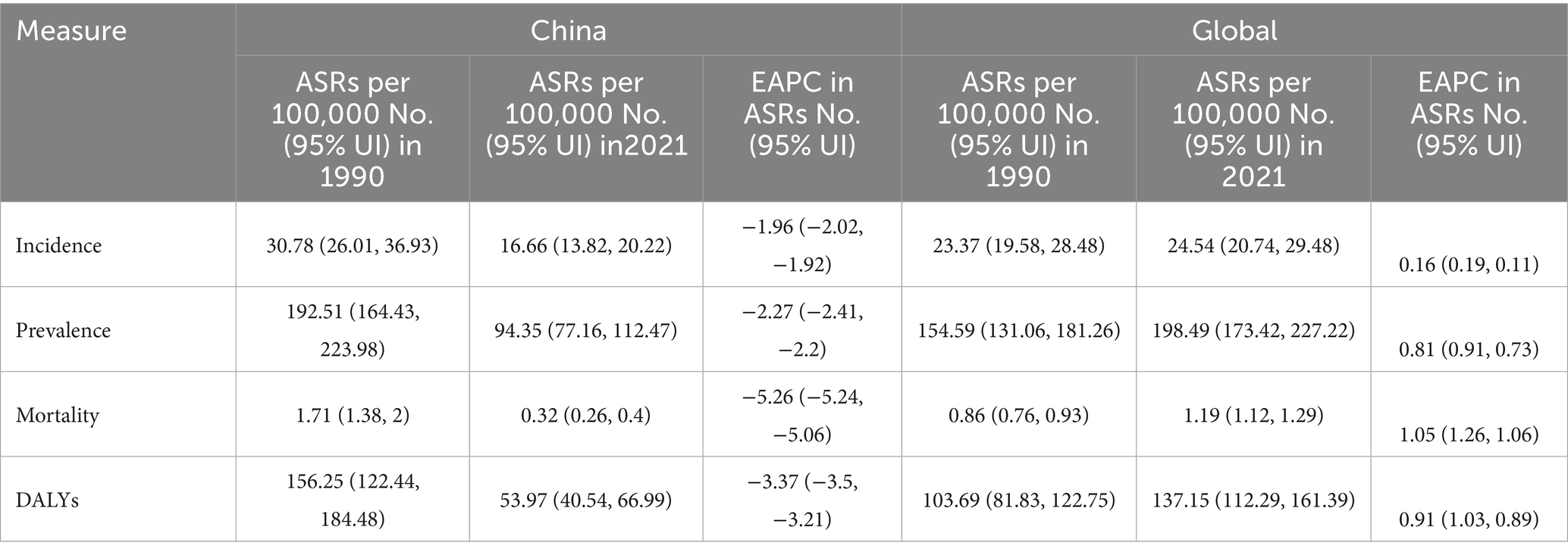 Table 1. ASRs of opioid use disorders in the China and total in 1990 and 2021, and the temporal trends from 1990 to 2021.
