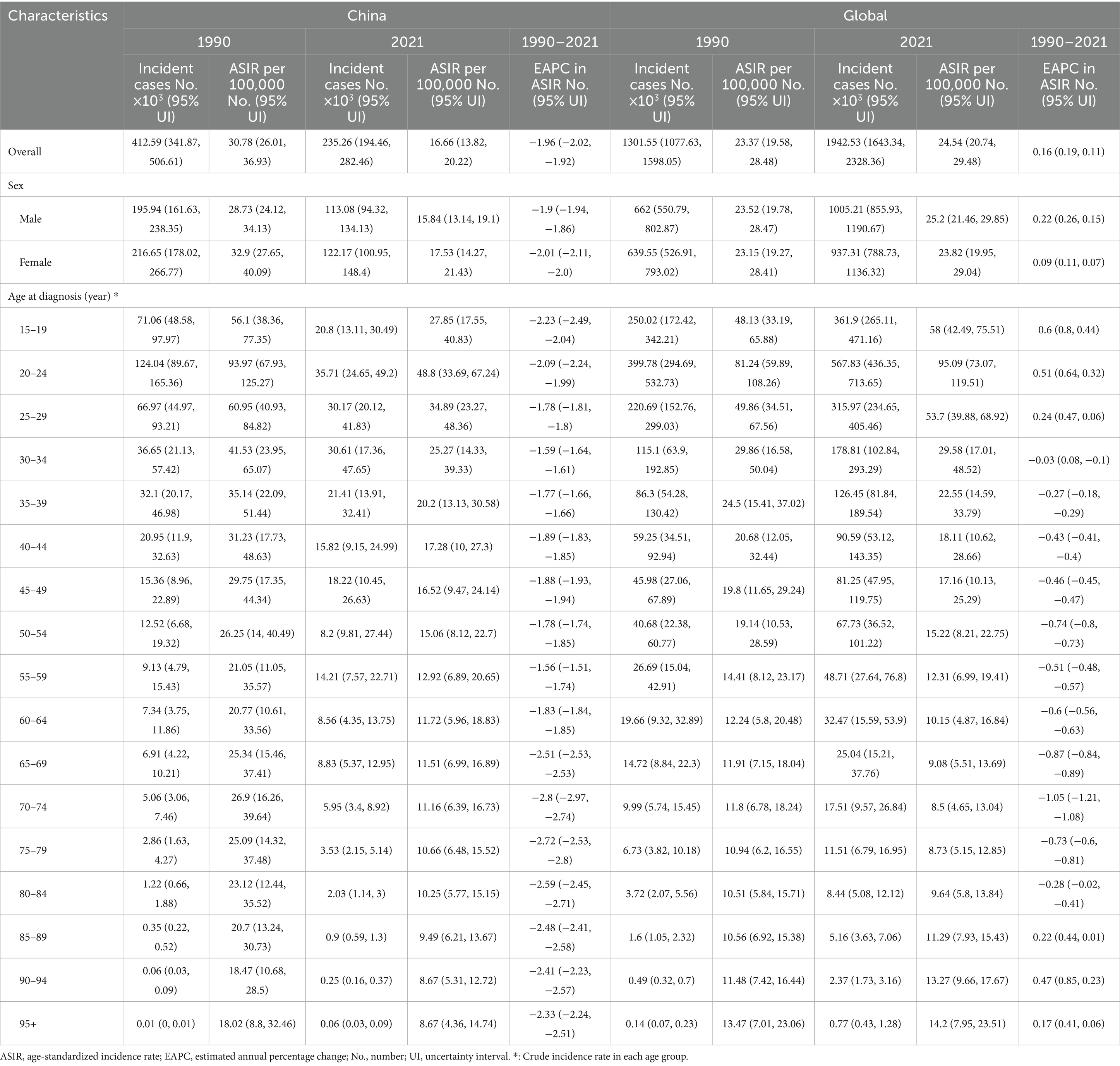 Table 2. Number of incident cases and incidence rate of opioid use disorders in the China and total in 1990 and 2021, and the temporal trends from 1990 to 2021.