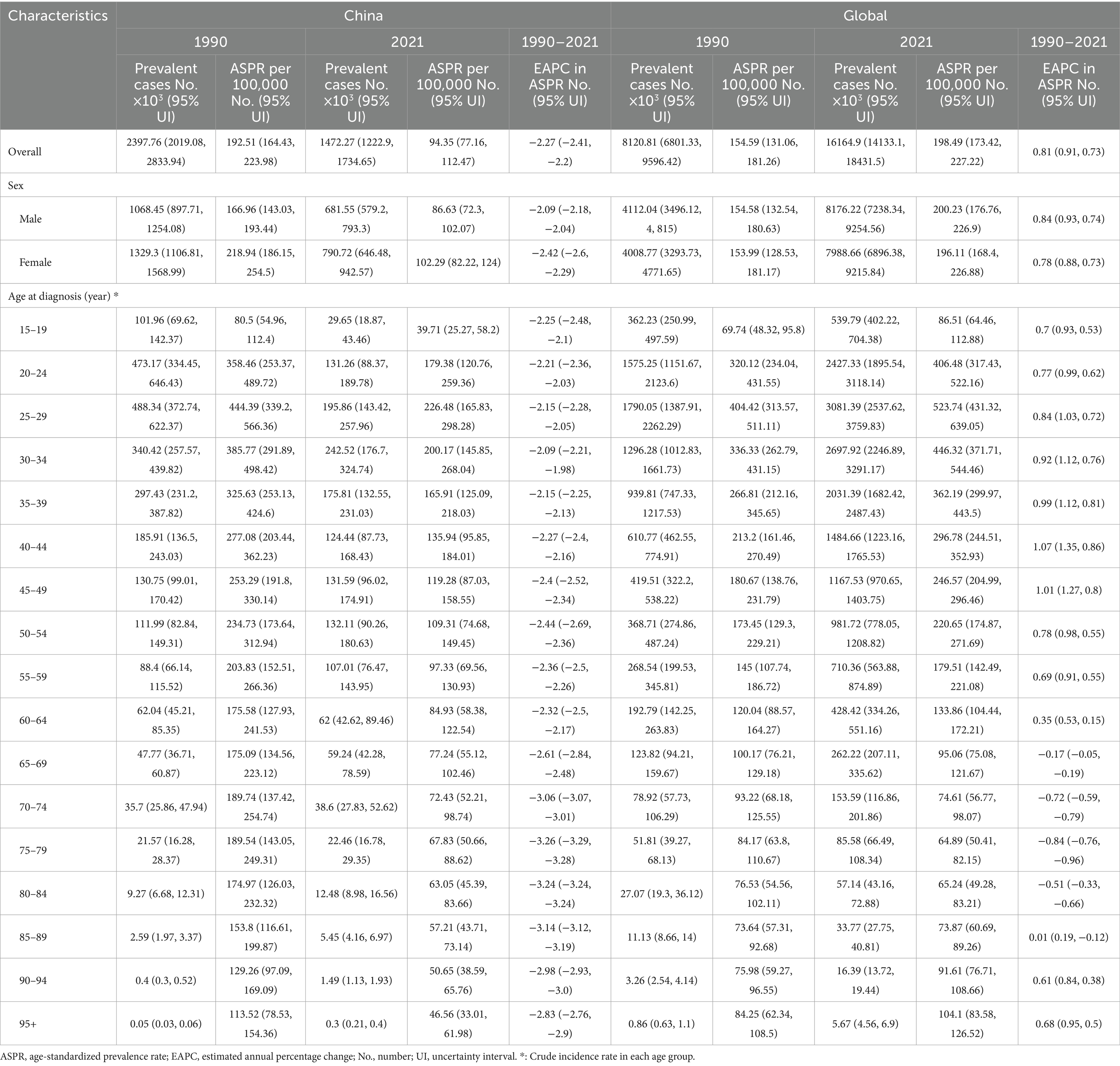 Table 3. Number of prevalent cases and prevalence rate of opioid use disorders in the China and total in 1990 and 2021, and the temporal trends from 1990 to 2021.