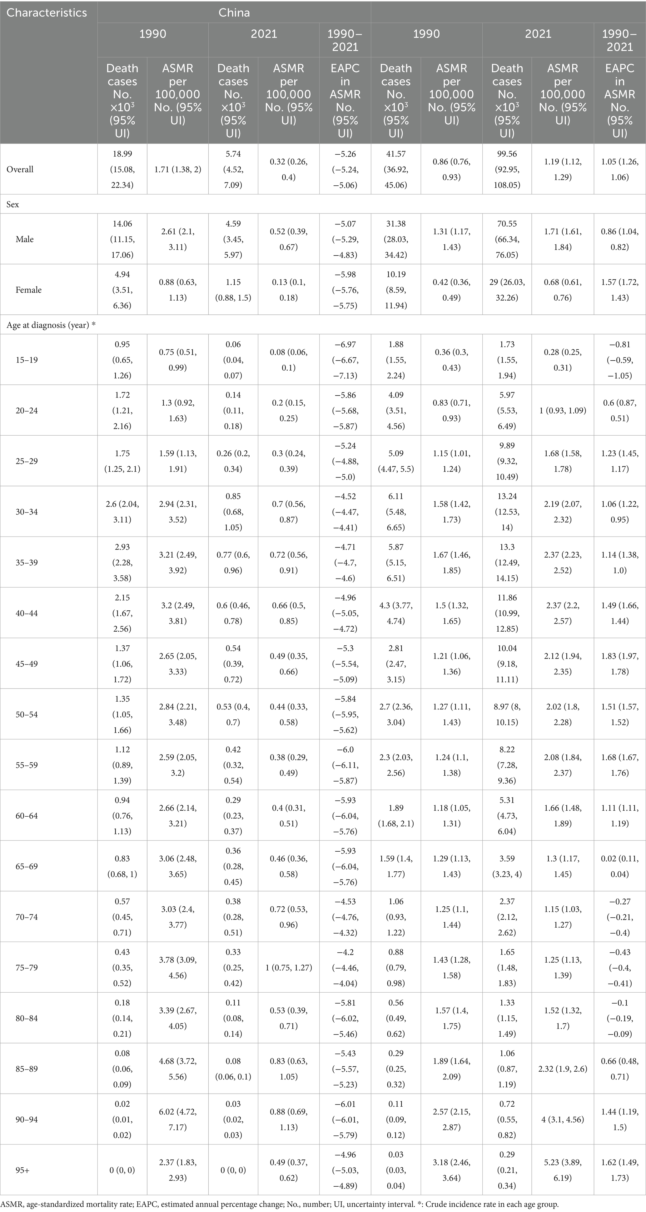 Table 4. Number of death cases and mortality rate of opioid use disorders in the China and total in 1990 and 2021, and the temporal trends from 1990 to 2021.