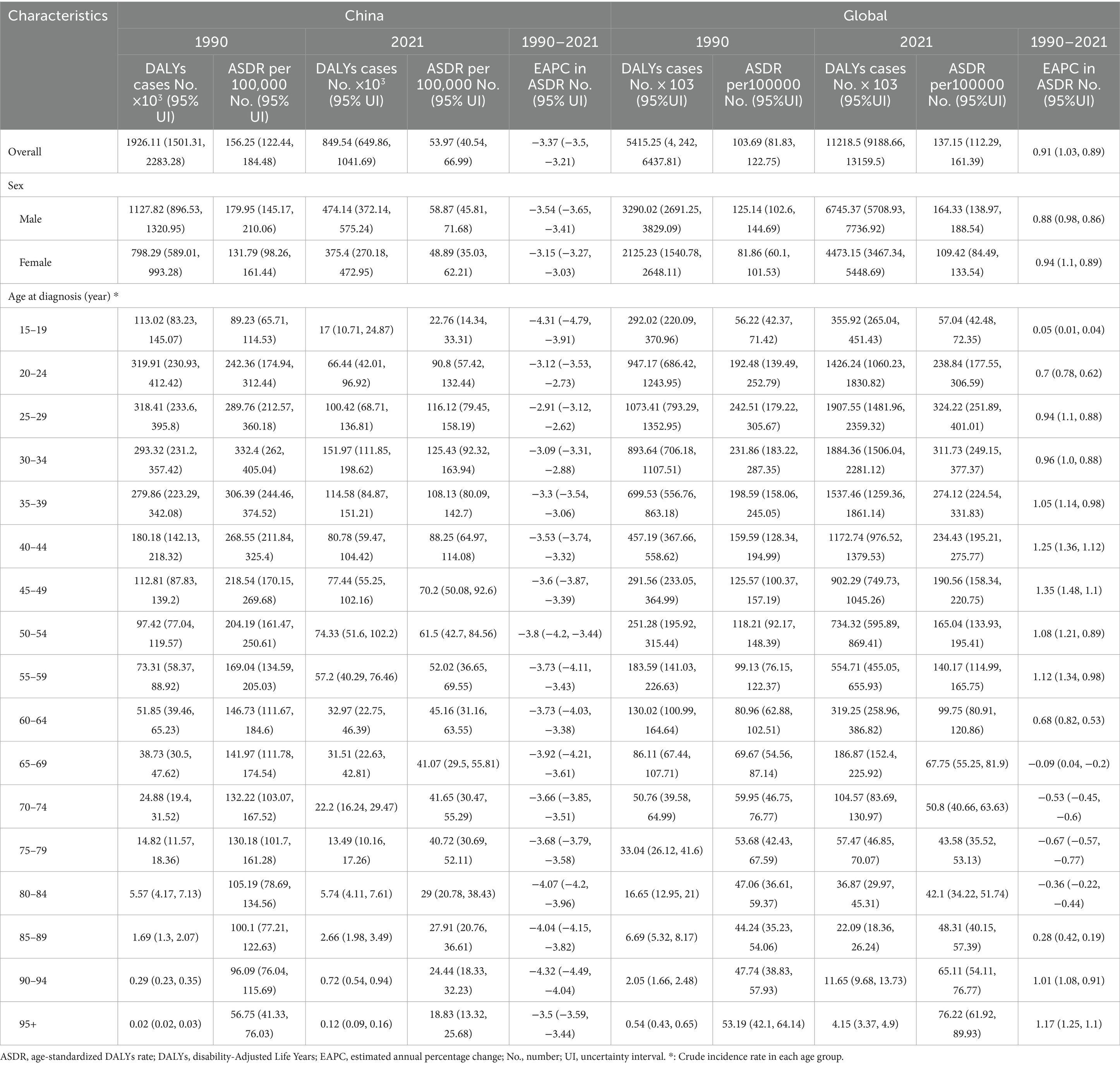 The overall trends in ASMR and ASDR for both males and females showed a decline (Figures 3C,D). ASMR and ASDR reached their lowest points in 2016 and 2017, respectively, with the male APCs at 1.73% for ASMR and 1.29% for ASDR, both lower than the female APCs of 3.15 and 3.66%. Subsequently, both ASMR and ASDR experienced a slight increase, with female ASDR showing the largest rise, marked by an APC of 3.66%.