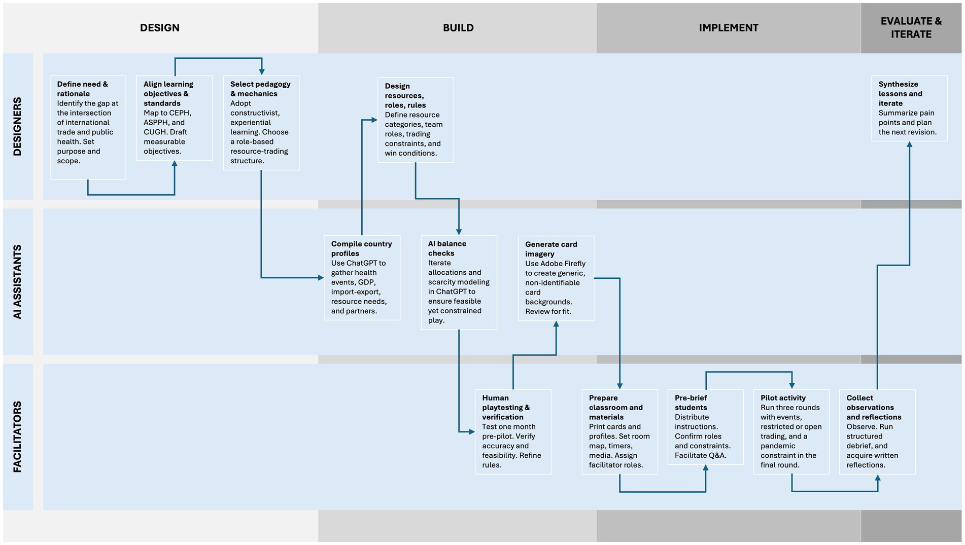 The activity development process is illustrated in Figure 1. Artificial intelligence (AI) tools played a role in the development of the Global Health Trade Summit activity, finding and packaging detailed, accurate, and engaging content. Specifically, OpenAI’s ChatGPT (Models GPT-3.5 Turbo & GPT-4), a generative AI chatbot (74), was extensively utilized to compile and analyze complex interdisciplinary data necessary for the simulation. This chatbot was used to gather historical information on each sovereign state, identifying significant events that majorly impacted population health. Additionally, ChatGPT assisted in constructing detailed economic profiles for each sovereign state, such as data on gross domestic product (GDP), related per capita economic indicators, and import–export portfolios. Moreover, this tool provided information about each sovereign state’s initial resource needs, changes in needs during the COVID-19 pandemic, and consequent changes to trade agreements or in trade relations.