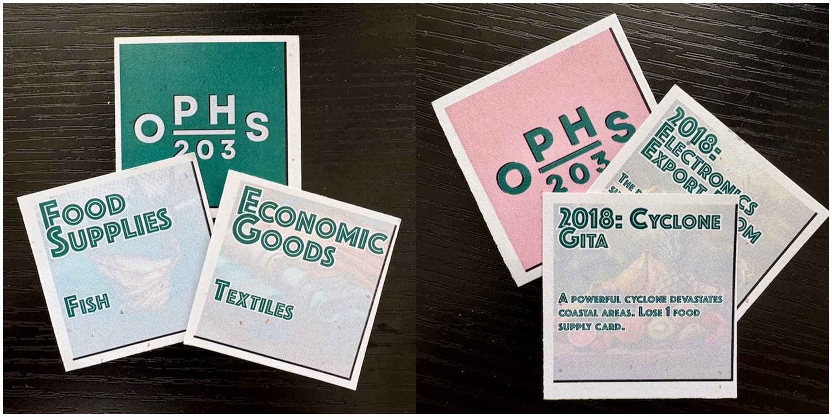 Each round began with students reviewing their available resources and needs, as specified in their sovereign state profiles. For most of each round, students were restricted to trading with their close trading partners, a limitation that was relaxed during the final minutes of each round to allow broader trade opportunities. During these periods, Trade Representatives moved around the classroom, negotiating trades with or offering aid to other sovereign states, while Health Ministers managed incoming trades and offers from their team’s designated area. If a team included a Finance Minister, that student tracked resources and provided strategic advice. Event cards (Appendix C), representing real-world disruptions or opportunities, were introduced in each round by the instructor. These cards altered the trading landscape by adding unexpected challenges or opportunities, such as resource gains or losses, simulating global trade complexities. Examples include generic events (e.g., foreign aid influx, natural disaster, economic boom, health crisis, trade embargo) and nation state-specific events (e.g., mineral discovery in the Democratic Republic of Congo, cholera resurgence in Haiti). Examples of resource and event cards can be seen in Figure 2.