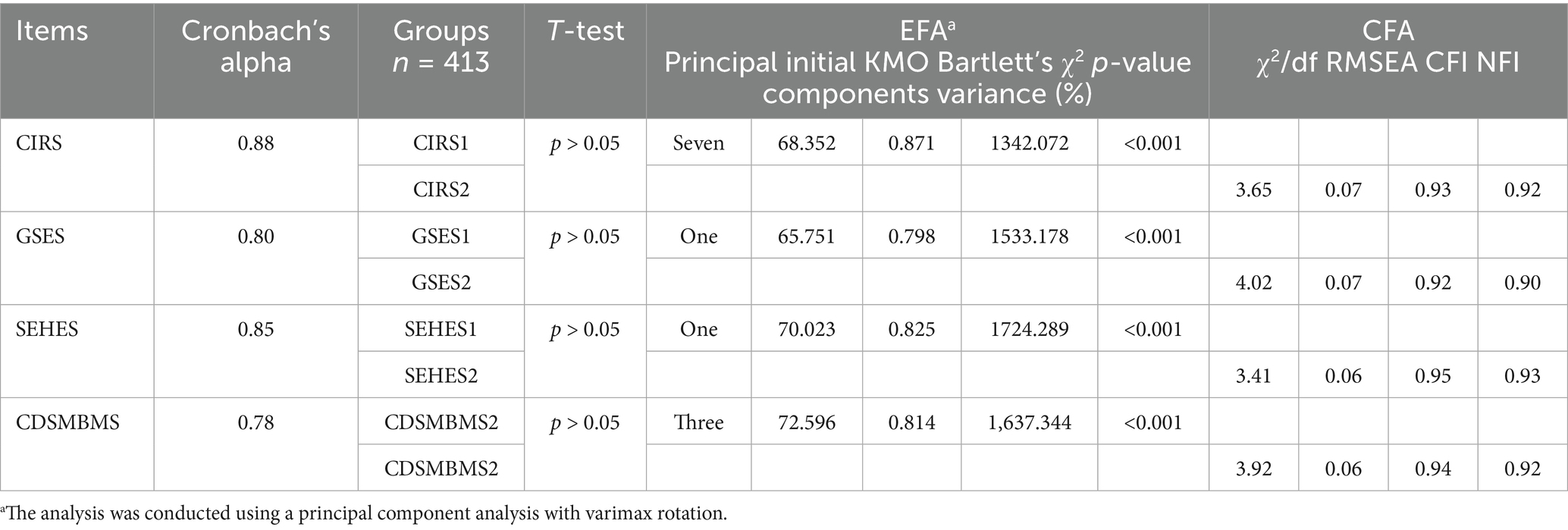 The validity of the scales was tested by factor analysis, with the samples split into two: one sample was conducted by exploratory factor analysis (EFA) and the other was conducted by confirmatory factor analysis (CFA). The latter was utilized to validate the factor structures of the samples got by EFA. The T-test analysis was applied to both samples. The goodness of fit of the scales was assessed by means of the model fit indices (22), supplemented by Maione et al. (23) as: χ2/df < 5, RMSEA < 0.08, CFI > 0.90 and NFI > 0.90. Furthermore, Cronbach’s alpha was applied to assess the reliability of the scales. In order to ascertain the validity of the scales utilized in this study, the samples were split into two parts, that is CIRS 1 (N = 413) and CIRS 2 (N = 413). T-test analysis was performed, and no significant difference in group and other variables was observed between the two samples (all p > 0.05). An exploratory analysis was conducted to ascertain the factor structure of the CIRS 1. This analysis took the form of a principal component analysis with varimax rotation. The results of this analysis revealed seven principal components, which explained 68.352% of the initial variance (KMO = 0.871, Bartlett’s χ2 = 1342.072, p < 0.001). The CFA was utilized to process CIRS 2, with the objective of verifying the seven-factor structure of CIRS 1, which had been obtained by EFA. The results of the CFA demonstrated acceptable fit indices (χ2/df = 3.65, RMSEA = 0.07, CFI = 0.93, NFI = 0.92). The Cronbach’s alpha for the scale was 0.88. Factor analysis and internal consistency of other scales are detailed in Table 2.