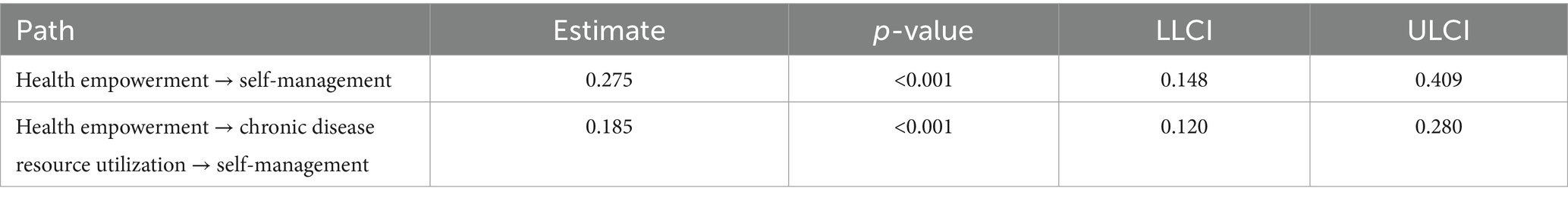 4.3 The mediating effects of chronic disease resource utilization and self-efficacy between health empowerment and self-management in older adult patients with chronic diseases