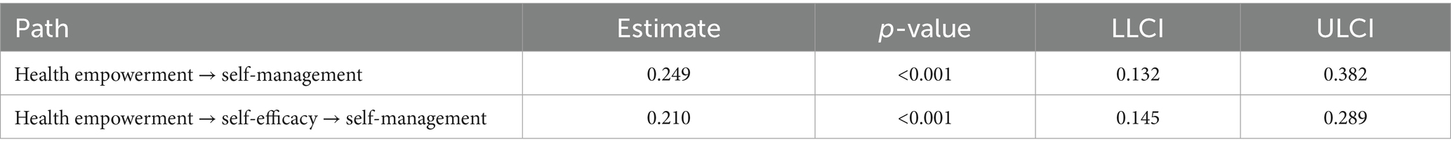 Second, the findings of this study demonstrate that self-efficacy exerts a partial mediating effect between health empowerment and self-management, with the mediating effect accounting for 22.2%. The concept of health empowerment has the capacity to exert a direct and positive influence on self-management. In addition, it may exert an indirect influence on self-management through the medium of self-efficacy. In accordance with Bandura’s self-efficacy theory (17), a patient’s confidence in their ability to successfully carry out a specific behavior will directly affect their self-management behavior. Consequently, patients who perceive themselves to possess the necessary capabilities for self-managing chronic diseases are more inclined to adopt such active strategies. This finding aligns with the results of previous research (56), which demonstrated a significant positive association between self-efficacy and patients’ self-management behaviors. It is imperative to exert influence on patients in order to effect changes in their self-management behaviors; this can be achieved by enhancing their sense of self-efficacy. For instance, following the provision of support and assistance from medical staff, patients will have greater confidence and motivation to proactively manage their disease. As demonstrated in another study (57), health empowerment has been shown to enhance the quality of life of patients. Among the factors identified, patients’ confidence in treatment and peer support have been shown to be significant in enhancing the quality of life. This, in turn, has been demonstrated to promote the improvement of self-management behaviors by enhancing patients’ self-efficacy. The direct impact of health empowerment on self-management can facilitate the design of effective health intervention strategies. The provision of relevant health knowledge and skills is an essential component of this approach, as is the enhancement of patients’ self-management abilities and the encouragement of proactive actions to manage chronic diseases. This includes the regular organization of educational and training activities, the establishment of support networks and community resources, and the improvement of accessibility and quality of medical services. The implementation of these intervention measures has been demonstrated to facilitate enhanced patient comprehension and proficiency in chronic disease management, thereby fostering increased engagement in self-directed healthcare.