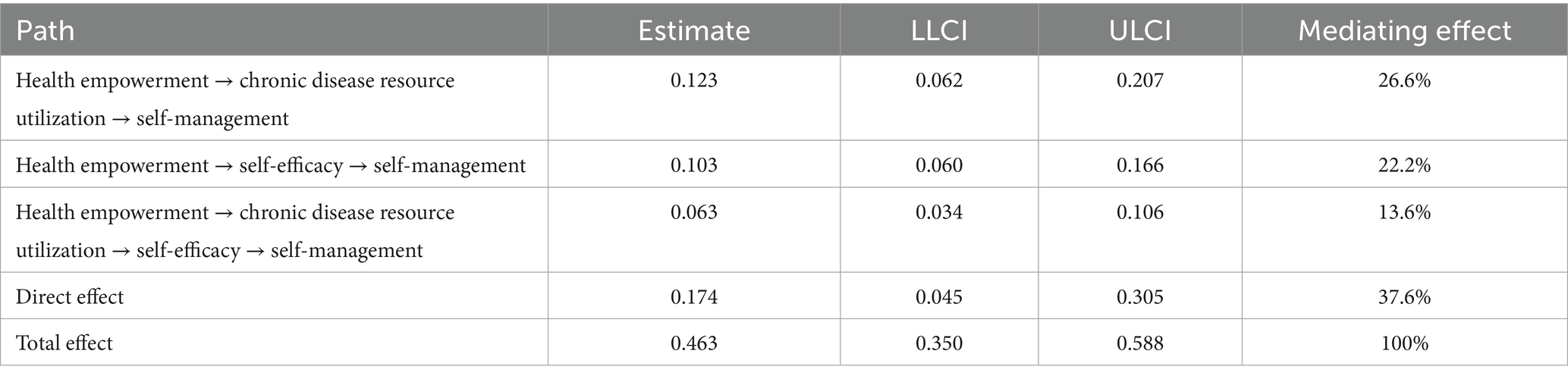 The PROCESS program was utilized in order to test the mediating effect of chronic disease resource utilization and self-efficacy on the relationship between health empowerment and self-management. First, health empowerment was designated as the independent variable, self-management as the dependent variable, and chronic disease resource utilization as the mediating variable, with all demographic variables in Table 1 serving as the control variables. The findings indicate that the model exhibits a high degree of compatibility (χ2/df = 1.09, CFI = 0.997, TLI = 0.996, RMSEA = 0.014, SRMR = 0.029). As shown in Table 7, the results of the bootstrap test for mediating effect demonstrate that the 95% confidence interval excludes the value of zero, thereby indicating a significant mediating effect. Second, health empowerment was designated as the independent variable, self-management as the dependent variable, and self-efficacy as the mediating variable, with all demographic variables in Table 1 serving as the control variables. The findings indicate that the model exhibits a high degree of compatibility (χ2/df = 1.78, CFI = 0.971, TLI = 0.966, RMSEA = 0.044, SRMR = 0.034). As shown in Table 8, the results of the bootstrap test for mediating effect demonstrate that the 95% confidence interval excludes the value of zero, thereby indicating a significant mediating effect. Third, health empowerment was designated as the independent variable, self-management as the dependent variable, chronic disease resource utilization and self-efficacy as the mediating variable, with all demographic variables in Table 1 serving as the control variables. The findings indicate that the model exhibits a high degree of compatibility (χ2/df = 1.45, CFI = 0.975, TLI = 0.971, RMSEA = 0.033, SRMR = 0.034). As shown in Table 9, the results of the bootstrap test for mediating effect demonstrate that the 95% confidence interval excludes the value of zero, thereby indicating a significant mediating effect.