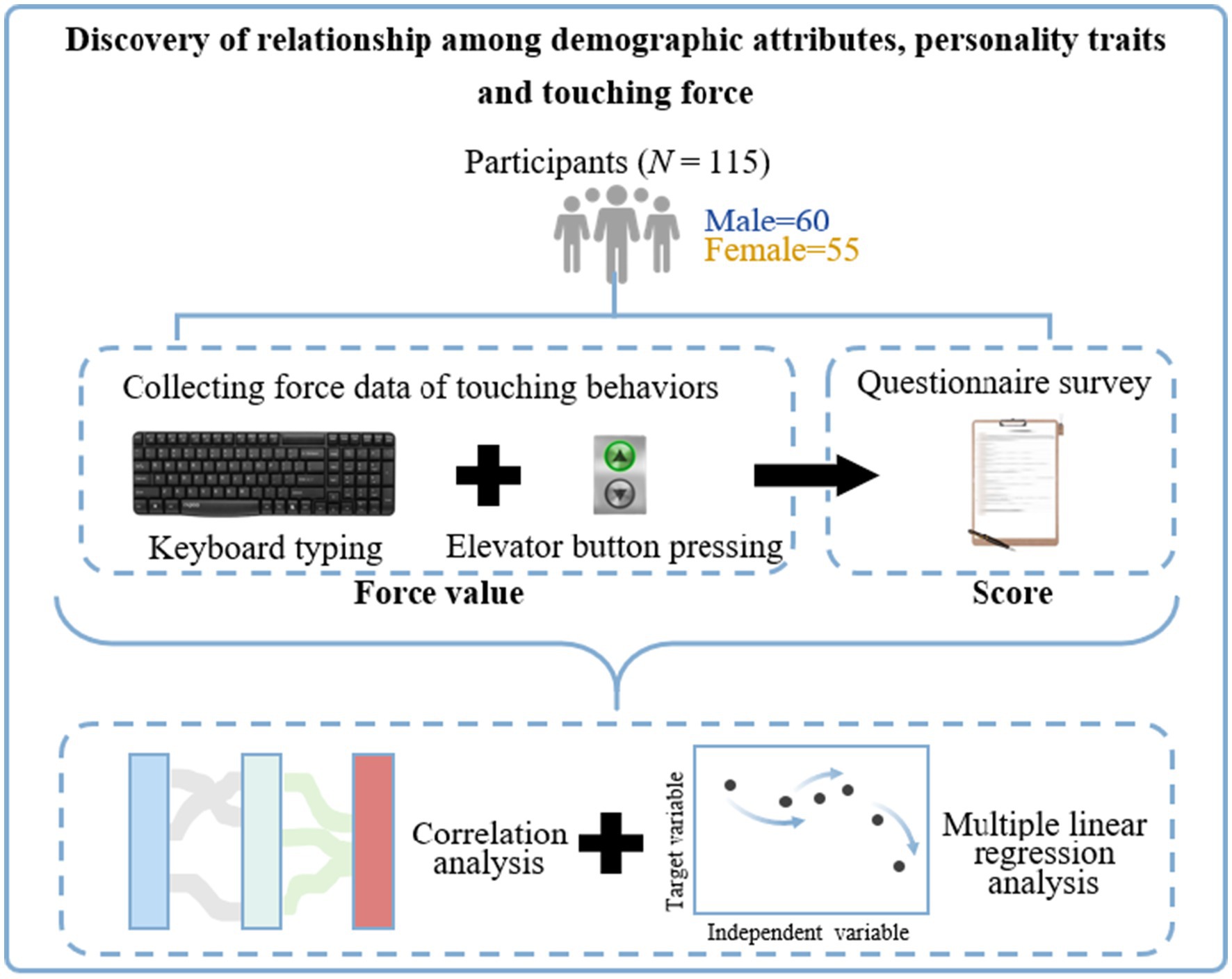 We recruited 115 participants to conduct formal test (Figure 1). Data on touch force were obtained from participants’ typing on keyboards and pressing elevator buttons. Data on demographic attributes and personality traits were collected through questionnaires and subjected to statistical analysis.