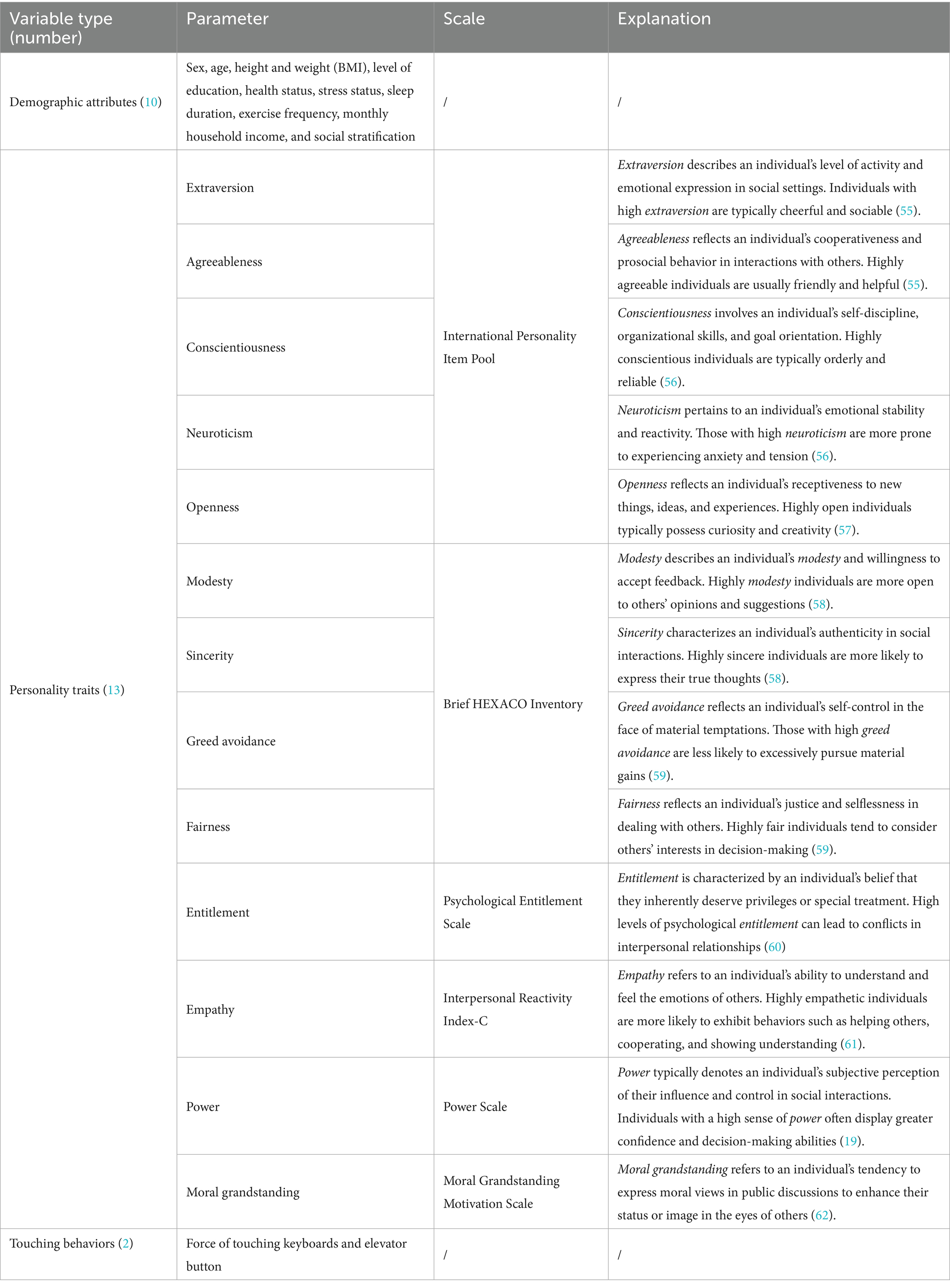 Individuals display substantial variation in their touch behaviors, influenced by both demographic attributes and personality traits. Younger individuals tend to exhibit higher activity levels and restlessness (11). Factors like body mass index (BMI), exercise frequency, and sleep duration also affect behavioral performance (12, 13). For instance, regular physical exercise can enhance individuals’ attention and memory, thereby improving their work efficiency in daily life. In contrast, individuals with insufficient sleep may exhibit more negative emotions during social interactions, which can adversely affect their interpersonal relationships (14). Empathetic individuals are more likely to follow epidemic prevention measures and may lead to lower infection risks (15), while those with a strong sense of entitlement are less compliant and face higher risks (16, 17). Psychological traits such as fairness perception, sense of power, and moral grandstanding significantly influence social behavior (18–20). However, there is a lack of understanding on the impact of demographic attributes and personality traits on touch behavior.