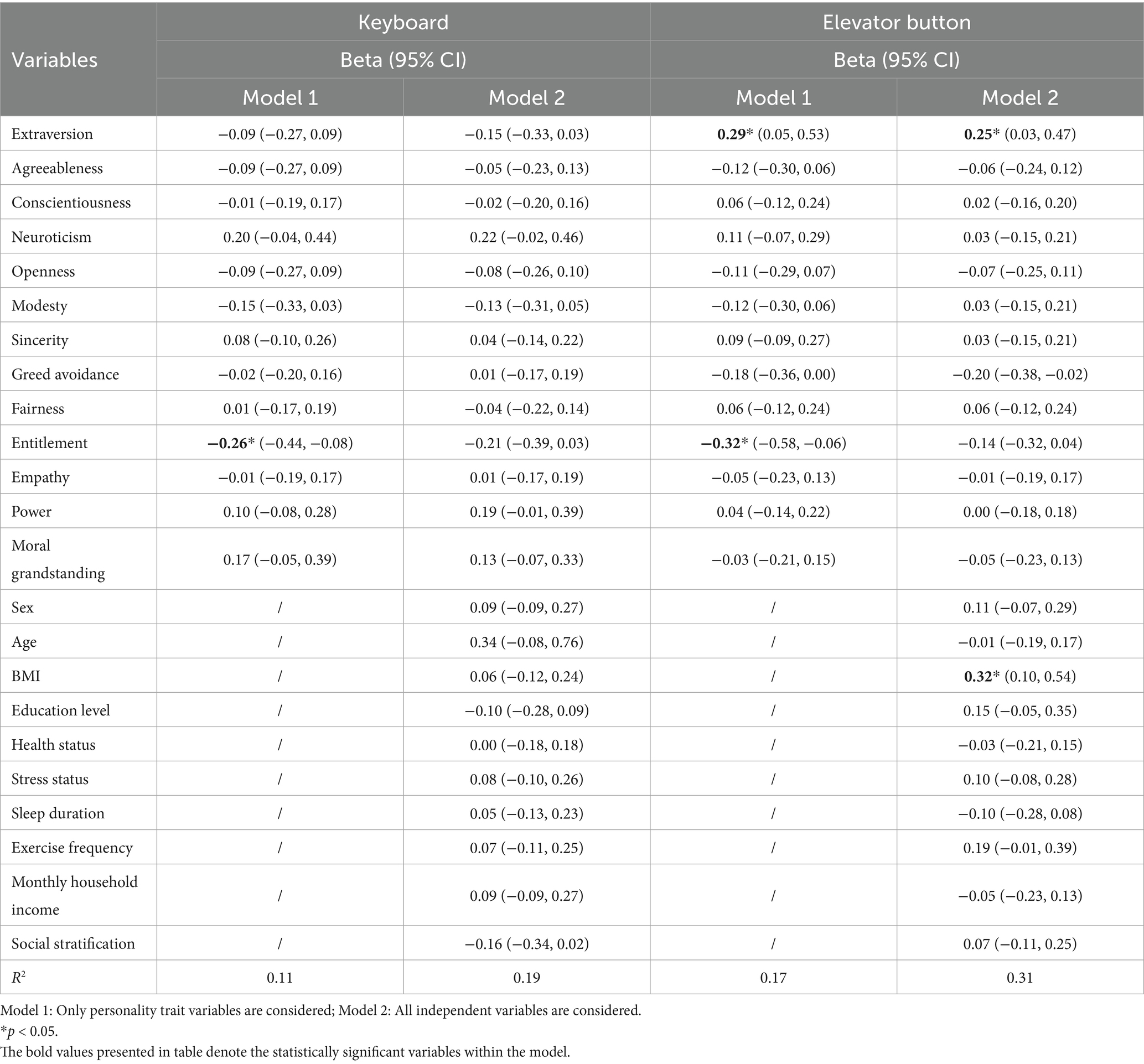 Finally, this study employed multiple linear regression analysis to further explore the relationship between touch force and both demographic attributes and personality traits. We explicitly emphasize that this regression model is exploratory, and its results should be considered preliminary and heuristic. The value of the variance inflation factor (VIF) was less than 5, indicating that there was no significant issue of multicollinearity problem (27) (Supplementary material G; Supplementary Table S4). Specifically, multiple linear regression models were used to estimate the effect of both demographic attributes and personality traits on touching keyboards and elevator button, respectively. To examine the specific contribution of each variable to touching force, for each touching behavior, we followed Rengifo (28) and Furnham (29), first regressed touching force onto all thirteen personality traits simultaneously (Model 1). Next, we added demographic attribute variables (Model 2). The further hierarchical regression models were used to evaluate the effect of the selected independent variables on touching force value, thereby constructing models with stronger predictive performance.