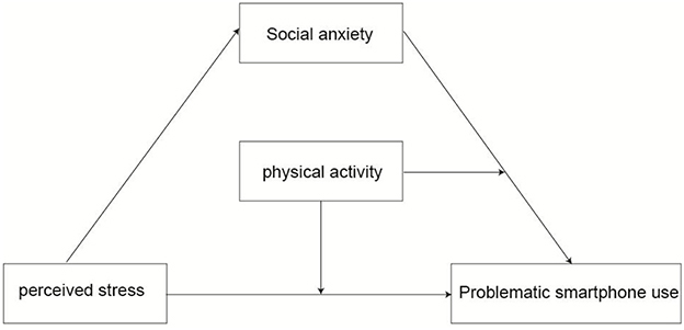 H1: Perceived stress has a significant positive predictive effect on college students' problematic smartphone usage; H2: Social anxiety plays a mediating role between perceived stress and problematic smartphone use; H3: Physical activity plays a regulatory role in relationships. If college students frequently engage in physical activity, the mediating effect of social anxiety will be more significant. The research variable model is shown in Figure 1.