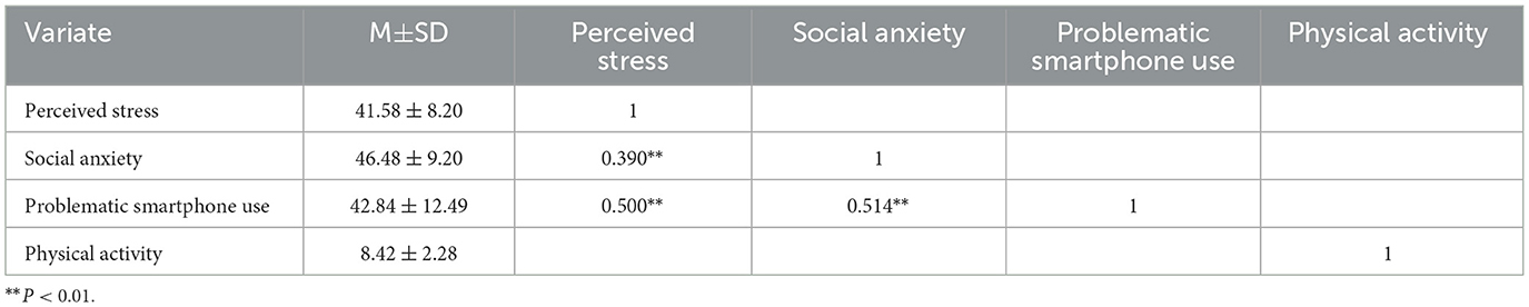 Table 1 presents the means, standard deviations, and correlation coefficients of the variables. The correlation coefficient between social anxiety and problematic smartphone use was 0.514 (P < 0.01), and the correlation coefficient between perceived stress and problematic smartphone use was 0.500 (P < 0.01), the correlation coefficient between perceived stress and social anxiety was 0.390 (P < 0.01), indicating a significant positive correlation between the two variables. These preliminary analyses support the subsequent hypothesis testing.
