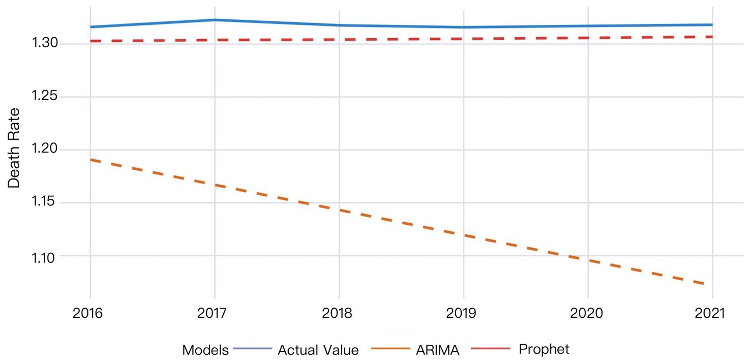 The ARIMA model exhibited larger deviations between predicted and actual values that progressively widened over time, whereas the Prophet model demonstrated superior predictive accuracy. According to the Prophet model, the actual mortality rate in 2016 was slightly higher than the predicted value. The actual mortality rate then showed a minor increase, reaching the peak value in 2017, while the predicted values remained stable, indicating the model’s partial failure to capture this temporal variation. The actual mortality rate then decreased and gradually became relatively stabilized since 2018, while the predicted values showed a slow upward trend, yet consistently underestimated the true values. The difference between the actual and predicted mortality rates decreased by 2021, though the predictions remained below actual measurements (Figure 1).