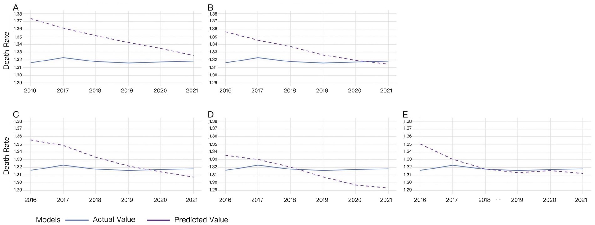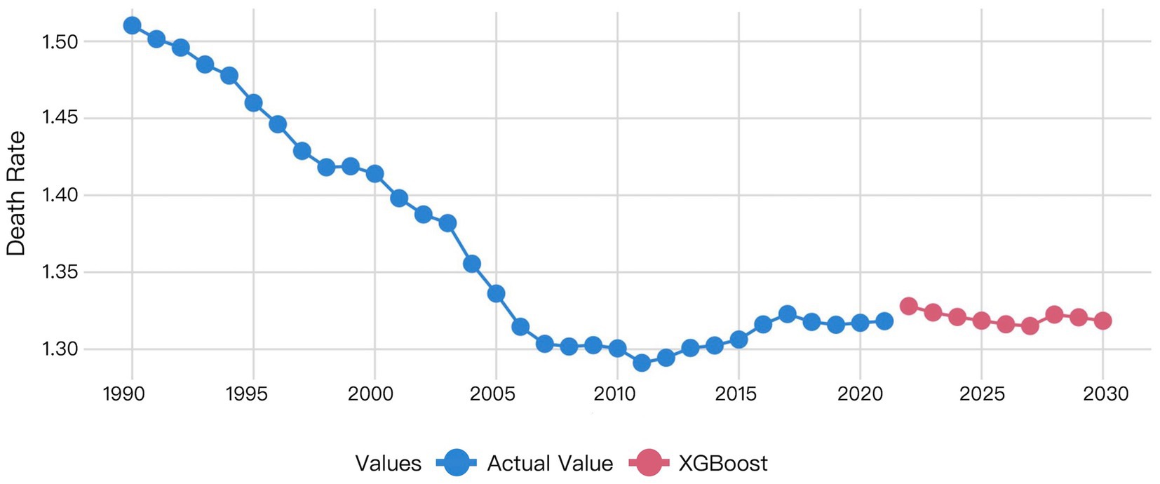 The XGBoost prediction results revealed a notable discrepancy between actual 2021 mortality rates and 2022 forecasts. This predicated mortality exhibited a progressive decline from 2022 to 2027, followed by a transient increase in 2028 before decrease (Figure 8).