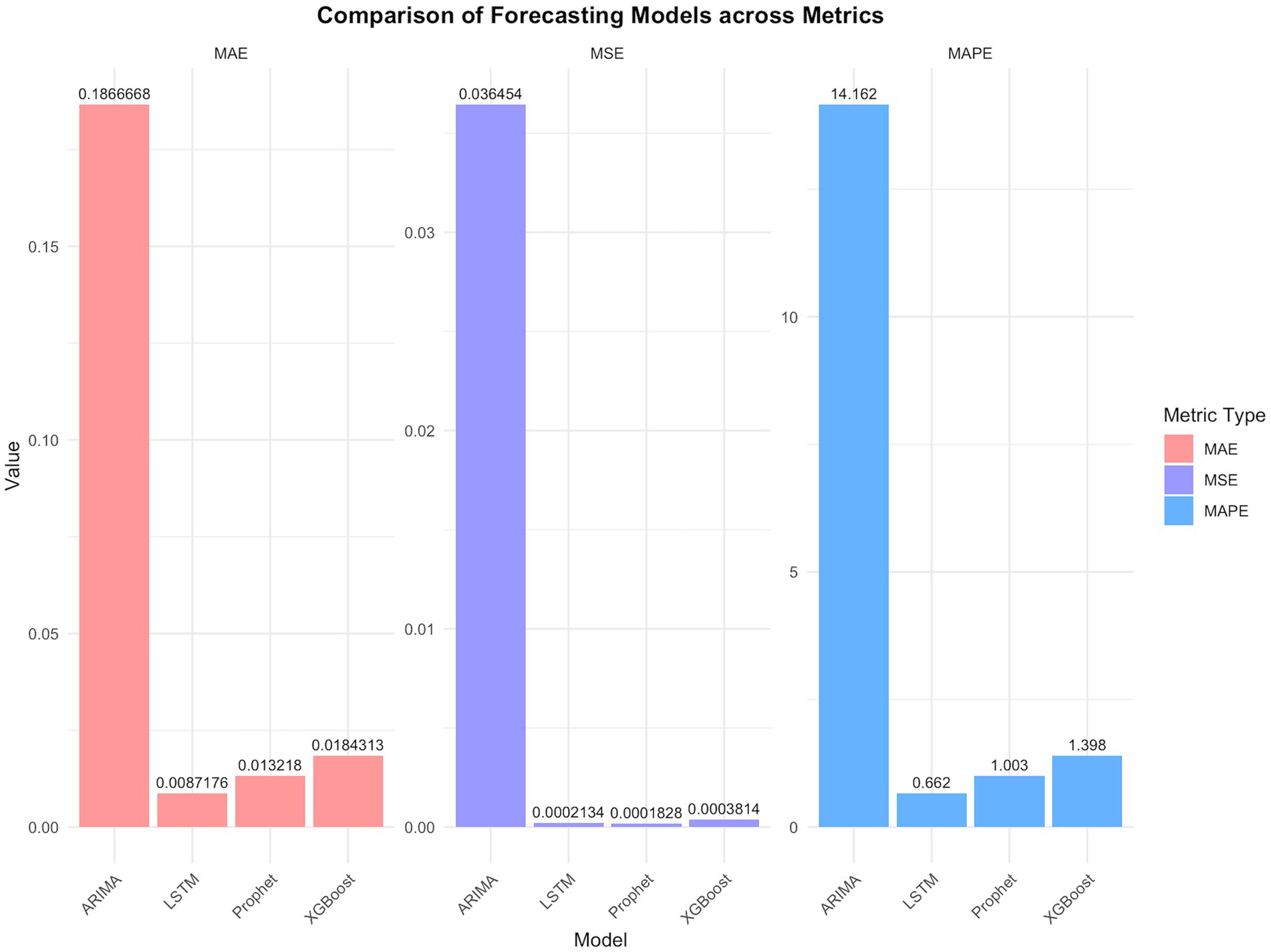 Notably, the statistical equivalence between LSTM and Prophet, as revealed by the DM test, can be further nuanced by the choice of loss function, with each metric highlighting different model strengths. The MSE heavily penalizes large deviations, making it sensitive to outliers. The MAE is more robust to extreme values. In contrast, the MAPE provides a scale-invariant comparison, which is particularly useful for understanding relative forecasting accuracy. The fact that LSTM and Prophet remain statistically equivalent across these diverse metrics—MSE, MAE, and MAPE—suggests that their performance parity is not an artifact of a single evaluation perspective but is robust to different measurements of error. This underscores that both models capture the underlying data generating process effectively, albeit through different architectural mechanisms, without consistently producing large errors or systematic biases that would be penalized differently by each loss function.