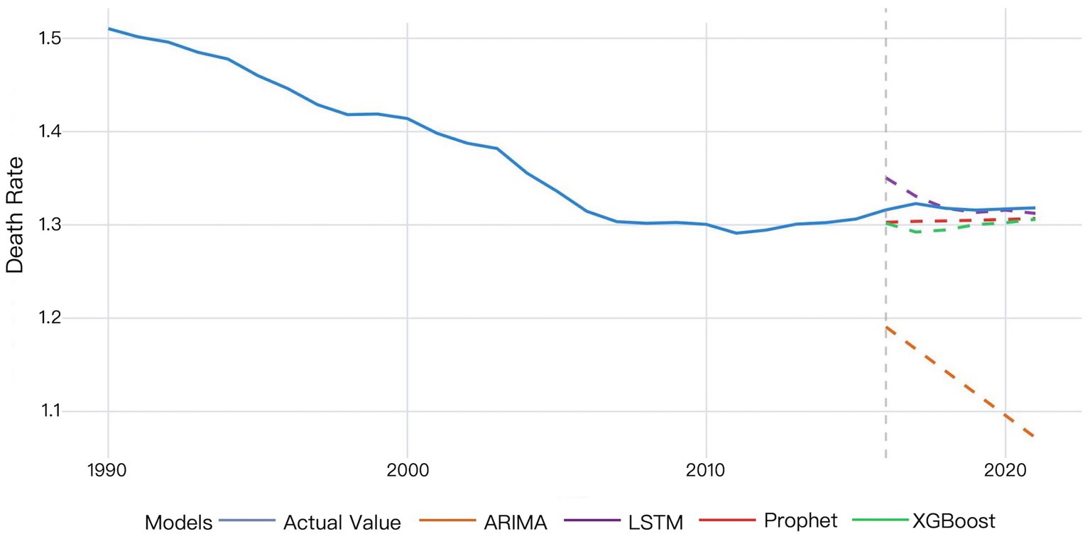 Results: The LSTM model demonstrated superior predictive accuracy on the validation set, with the lowest error rates across all metrics (MSE: 0.00021; MAE: 0.00872; MAPE: 0.662%). All the other models demonstrated statistically significant superiority over ARIMA (MSE: 0.03645; DM test p < 0.05 for all metrics). According to the DM test, both Prophet and LSTM demonstrated high predictive accuracy (p = 0.8762 for DM test based on MSE; p = 0.4292 for DM test based on MAE; p = 0.4303 for DM test based on MAPE). The LSTM model predicted that the mortality rate will exhibit an initial decline followed by a stabilization trend from 2022 to 2030, while the Prophet model predicted that the mortality rate will continue to rise.