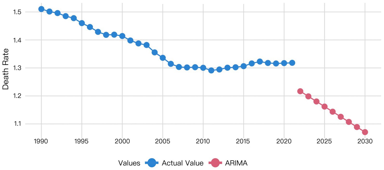 Figure 6 indicated that the ARIMA model predicts a gradual decline in HHD mortality among WCBA from 2022 to 2030.