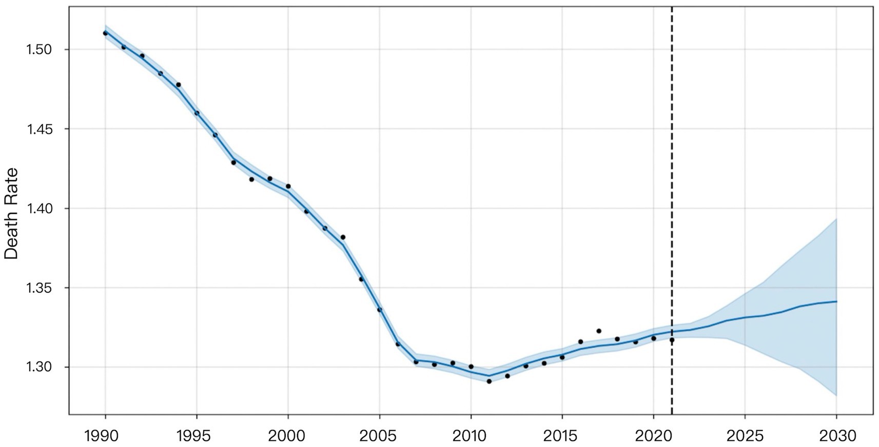 Using Prophet in Python 3.1.1, we formatted the data with years as “ds” (datetime) and mortality rates as “y” per package requirements. The model was initialized with yearly_seasonality = True to account for annual patterns, while disabling weekly and daily seasonality given the yearly timestamp resolution.