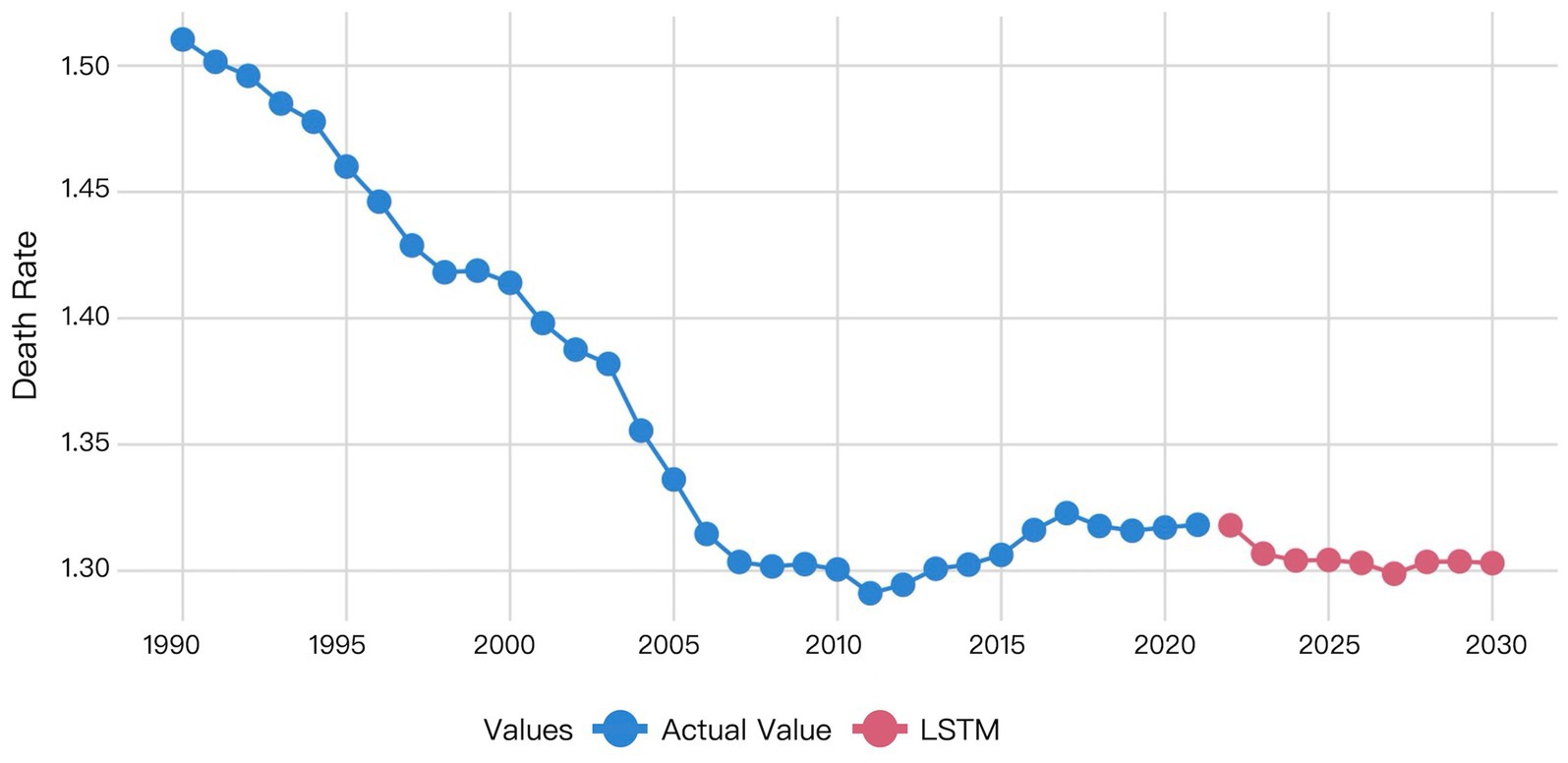 The LSTM model predictions demonstrated that the predicted mortality rate in 2022 was closely aligned with the actual mortality rate in 2021. Subsequently, the predicted mortality exhibited a downward trend from 2022 to 2023, and remained essentially stable from 2024 to 2030, at levels consistent with the 2023 forecast (Figure 9).