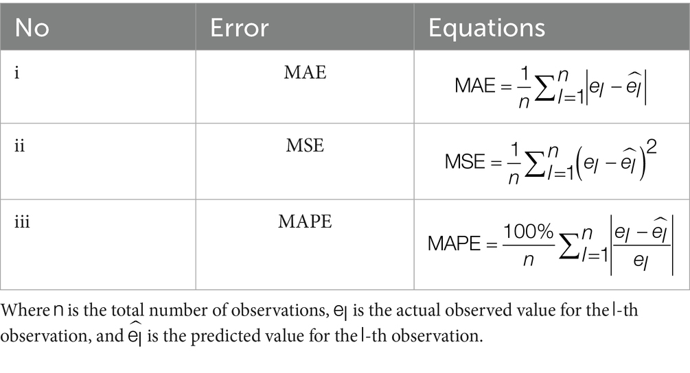 The MAPE was expressed as a percentage and served as the primary standard for accuracy classification. MAPE<10% indicated high prediction accuracy, 10% < MAPE<20% indicated good accuracy, 20% < MAPE<50% indicated reasonable accuracy, MAPE≥ 50% indicated poor accuracy (24). MAPE<20% was set as the threshold for determining satisfactory prediction accuracy, based on these established criteria and the specific accuracy requirements of the study.