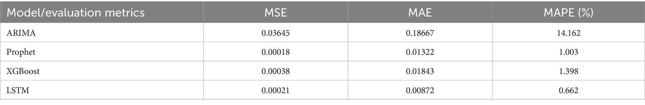 The MAPE values of four models were all below 20%, demonstrating prediction efficiency exceeding 80%. The LSTM model demonstrated superior predictive accuracy, with the lowest error rates across all metrics (MSE: 0.00021; MAE: 0.00872; MAPE: 0.662%), confirmed by the comparative visualization of MAE and MSE metric (Table 2 and Figures 4, 5). According to the DM test, both Prophet and LSTM demonstrated higher predictive accuracy than the other models (Tables 3–5). And there was no significant difference between Prophet and LSTM (p = 0.8762 for DM test based on MSE; p = 0.4292 for DM test based on MAE; and p = 0.4303 for MAPE). The prediction performance of XGBoost was significantly better than ARIMA (p = 0.0003 for DM test based on MAE), while weaker than Prophet (p = 0.0341 for DM test based on MAE and p = 0.0339 for DM test based on MAPE). And there was no significant difference between XGBoost and LSTM (p = 0.1946 for DM test based on MAE and p = 0.1951 for DM test based on MAPE). For ARIMA, the prediction performance was significantly weaker than the other models (MSE: 0.03645; DM test p < 0.05). In conclusions, Prophet and LSTM were the top-performing models. XGBoost was also a powerful prediction model better than the traditional methods. The model selection of Prophet and LSTM in application was suggested to be determined by the non-performance factors, such as interpretability and computational efficiency.