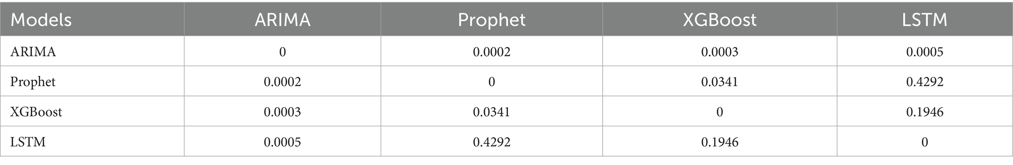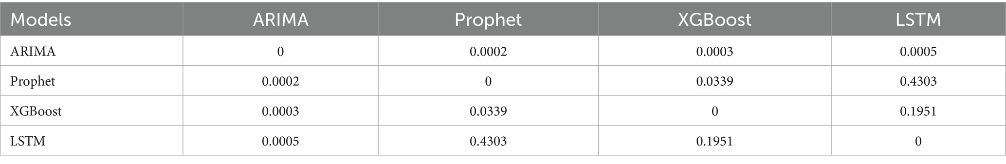 The test was conducted pairwise for all model combinations at a significance level of α = 0.05. A p-value less than 0.05 leads to the rejection of the null hypothesis, indicating a statistically significant difference in forecasting performance.