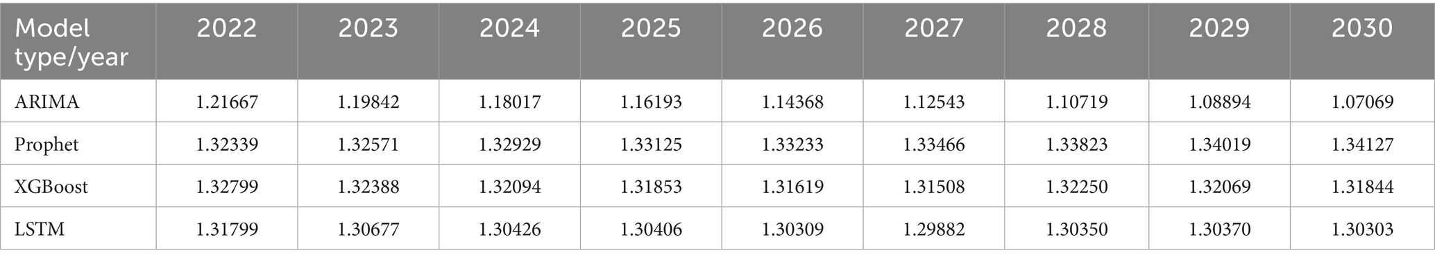 XGBoost is a classical machine learning model based on gradient-boosted trees. It employs lagged features for time series modeling, with its performance heavily dependent on the appropriateness of feature engineering. This study employs a time window of 4 as input. While this configuration demonstrates a statistically significant improvement over ARIMA (DM test, p < 0.05 for all metrics), its performance relative to Prophet depends on the error metric. Based on MAE loss, Prophet was statistically superior to XGBoost (p = 0.0341); similarly, under MAPE loss, Prophet also showed a significant advantage (p = 0.0339); however, under MSE loss, their difference was not statistically significant (p = 0.0762). The predictive accuracy of our model is significantly influenced by feature selection. The binary splitting mechanism of decision trees struggles to capture gradual transitions in time series, resulting in poorer stability for long-term forecasts. Compared to deep learning models, XGBoost demonstrates a 78.72% higher MSE than LSTM on the validation set; however, the DM test indicated that this difference was not statistically significant (p = 0.5441 for MSE; p = 0.1946 for MAE; p = 0.1951 for MAPE). This finding aligns with the conclusion of Nguyen et al. (28) for time series forecasting tasks, XGBoost’s performance lies between traditional statistical models (ARIMA) and deep learning approaches (LSTM).