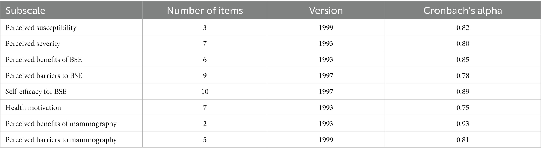 The HBM’s relevance is further underscored by its operationalization through validated instruments. Champion (33) was the first to apply the HBM framework specifically to explore women’s beliefs about breast cancer and breast screening behaviors, including BSE and mammography. As a result, the Champion’s Health Belief Model Scale (CHBMS) was developed (34, 35), which has since become one of the most widely used tools to predict screening behaviors. The scale has been translated into several languages and adapted to various cultural contexts, making it a robust instrument for cross-cultural studies.
